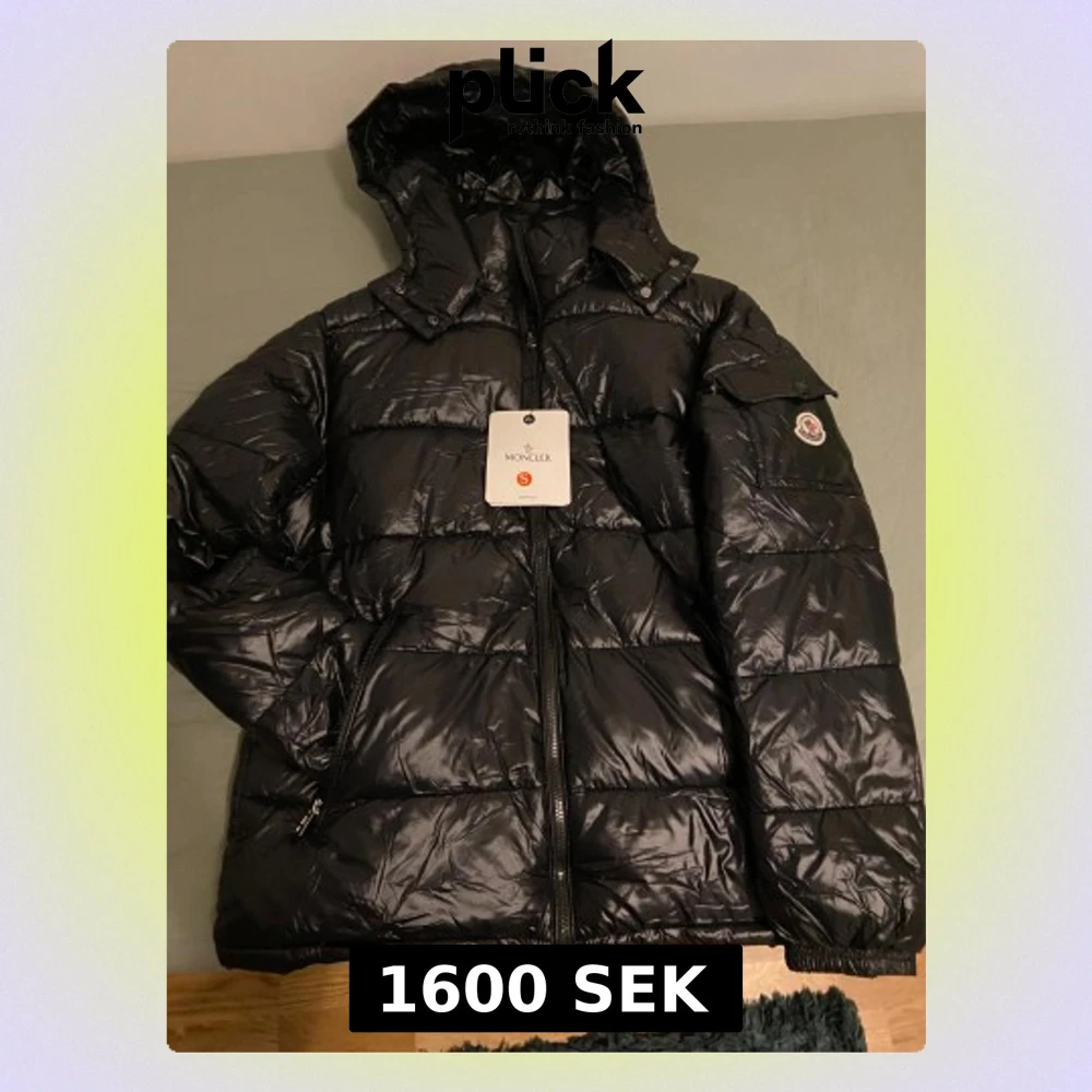 Svart pufferjacka från Moncler med glansig finish, huva och dragkedja framtill. Jackan har klassisk Moncler-logga på ärmen och coolt serietryck på insidan. Fylld med vitt gåsdun för extra värme. Perfekt för kalla dagar och snygg streetstil.