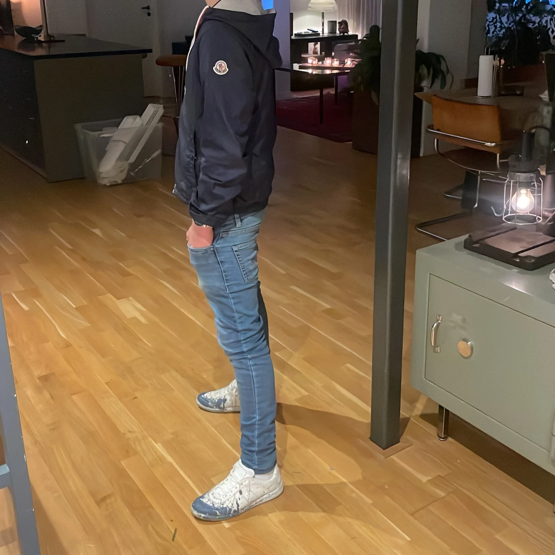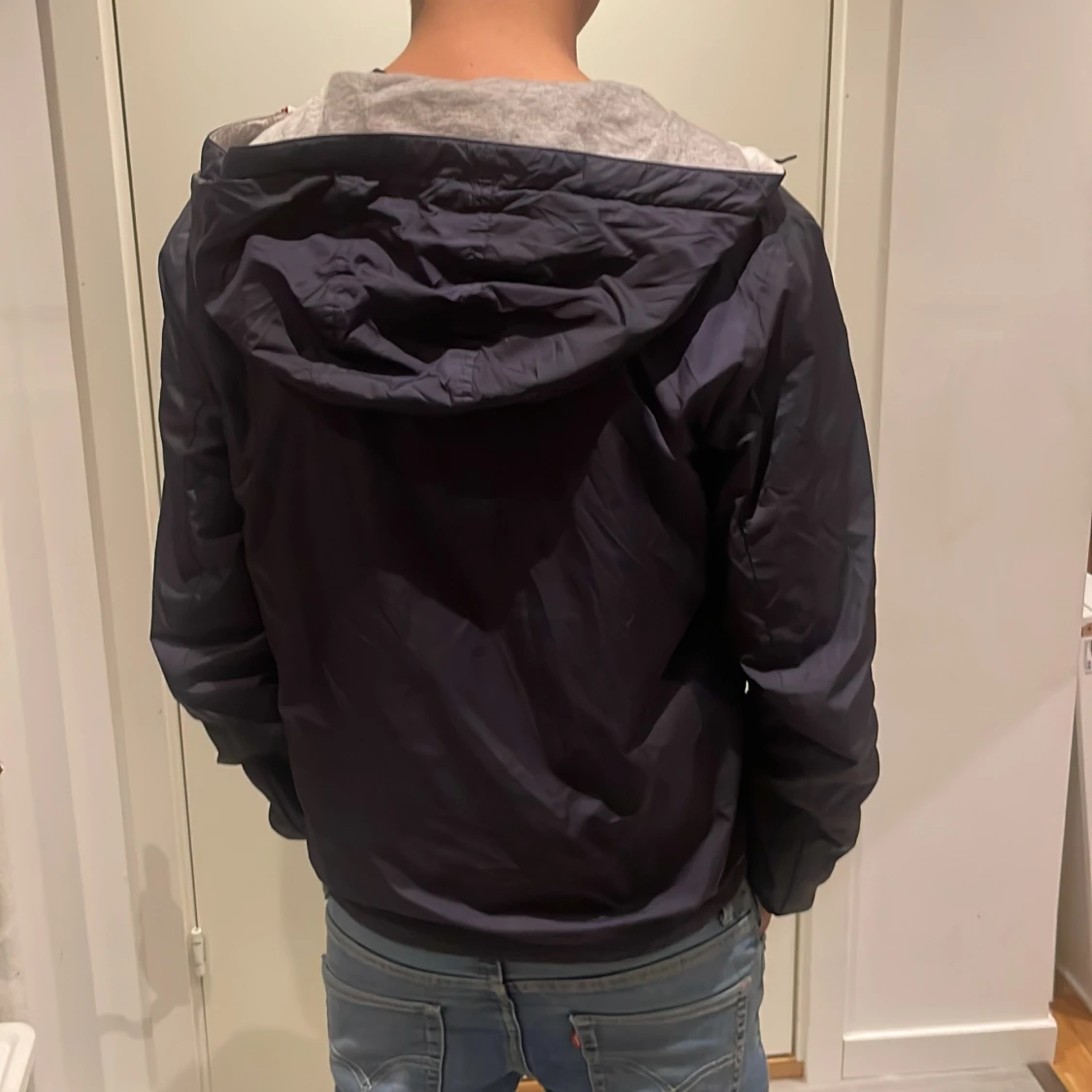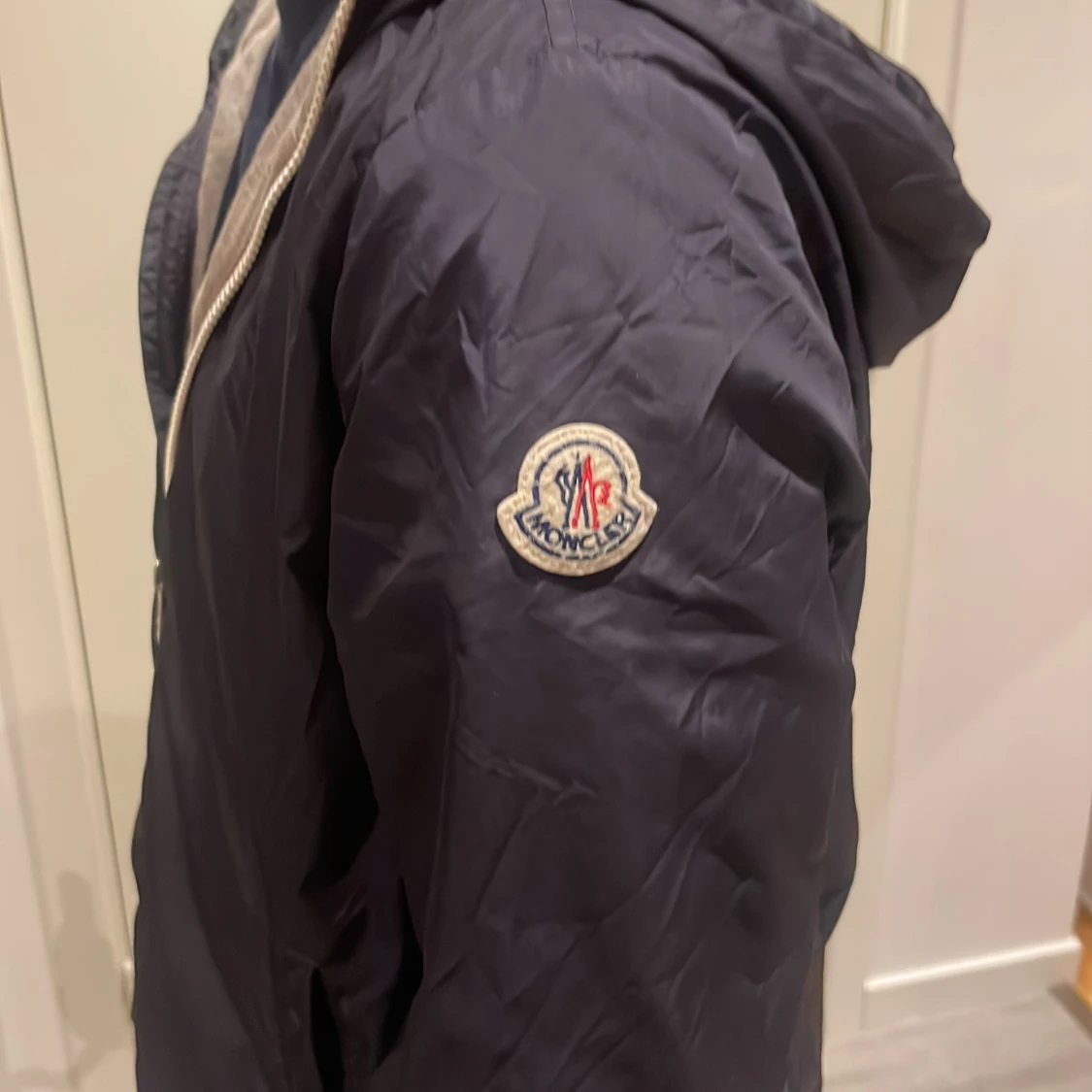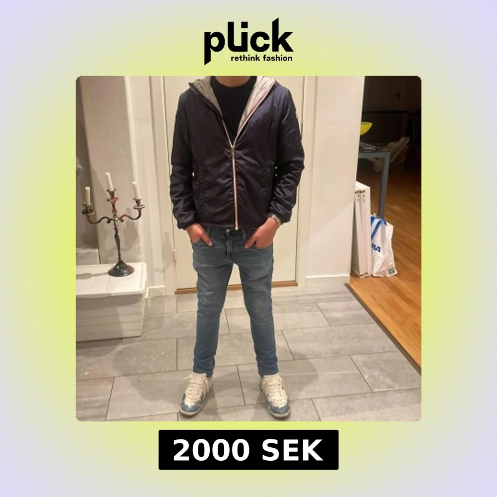 Snygg mörkblå vindjacka från Moncler med huva och vit dragkedja. Jackan har en klassisk Moncler-logga på ärmen och grått innerfoder. Perfekt för dig som vill ha en stilren outfit. Passformen är normal och jackan är långärmad. Skicket är nästan perfekt har använt fåtal gånger. Säljer för ska köpa ny! Storlek 164cm.
