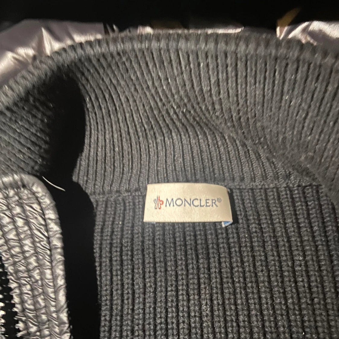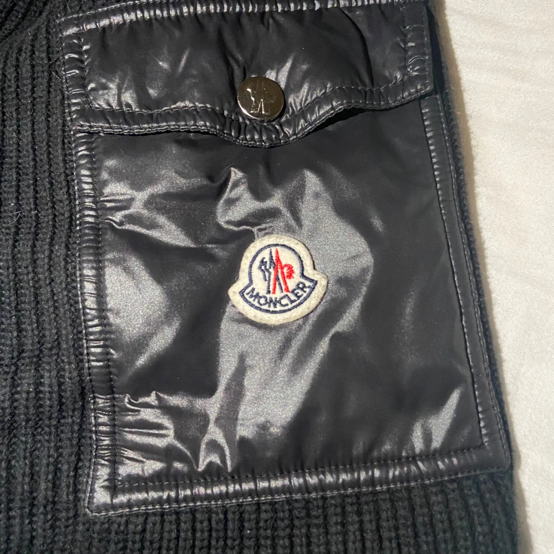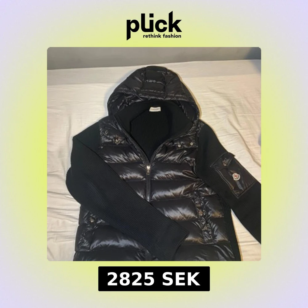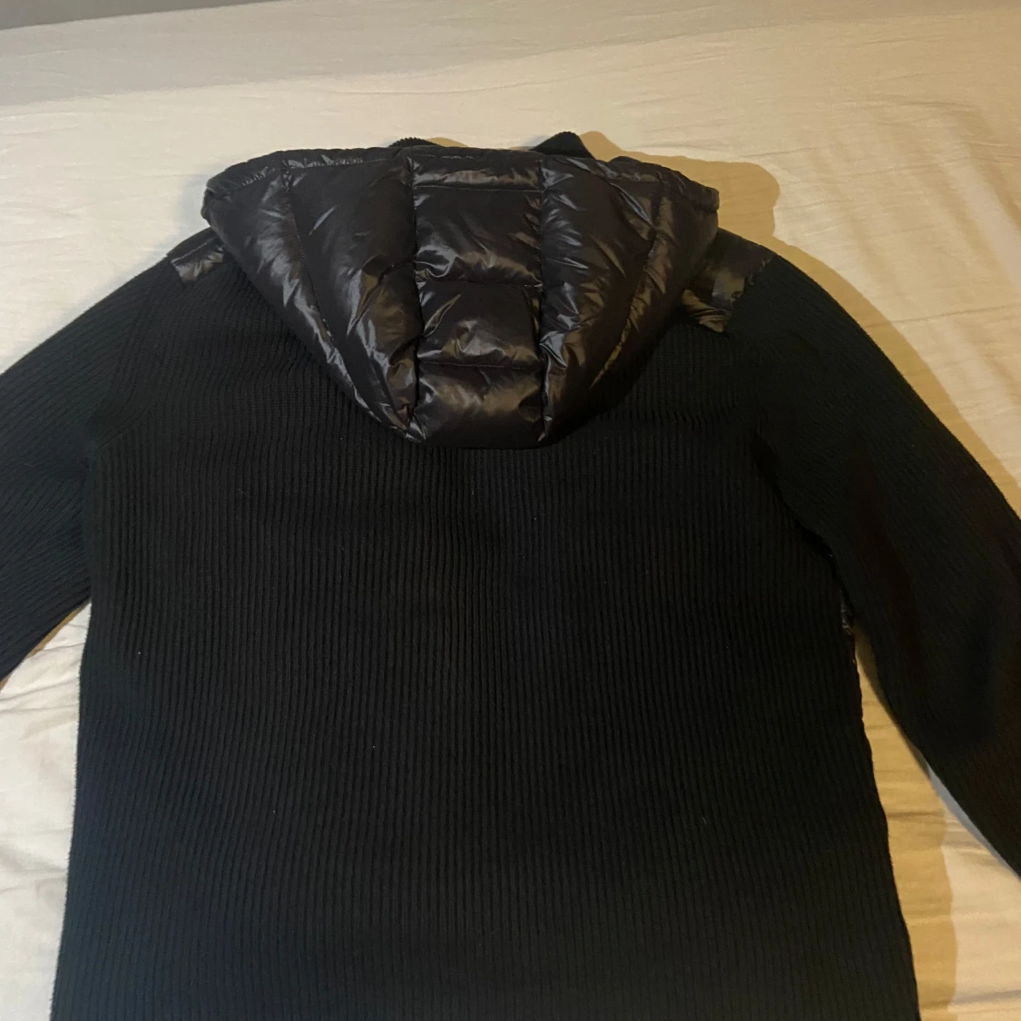 Svart pufferjacka från Moncler med stickade ärmar och huva. Jackan har quiltad front i blankt material, dragkedja och en snygg ficka med Moncler-logga på ärmen. Perfekt för dig som vill ha en cool och varm jacka med streetkänsla. Jackan är i bra skick. Ända defekten är ett litet hål vid nedre delen av magen. Skick 8/10.