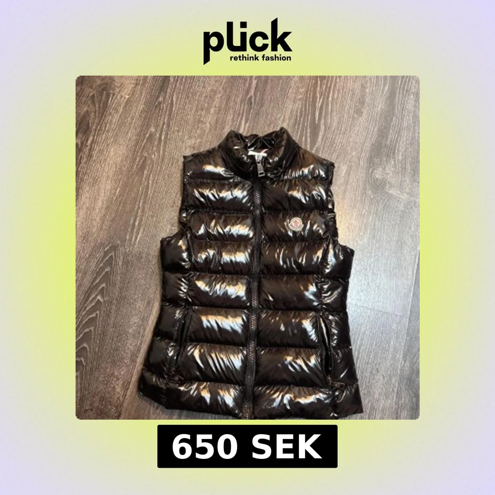 Snygg svart dunväst från Moncler med glansig finish och hög krage. Västen har dragkedja framtill och två fickor med dragkedja. Klassisk Moncler-logga på bröstet och serietidningsetikett på insidan.