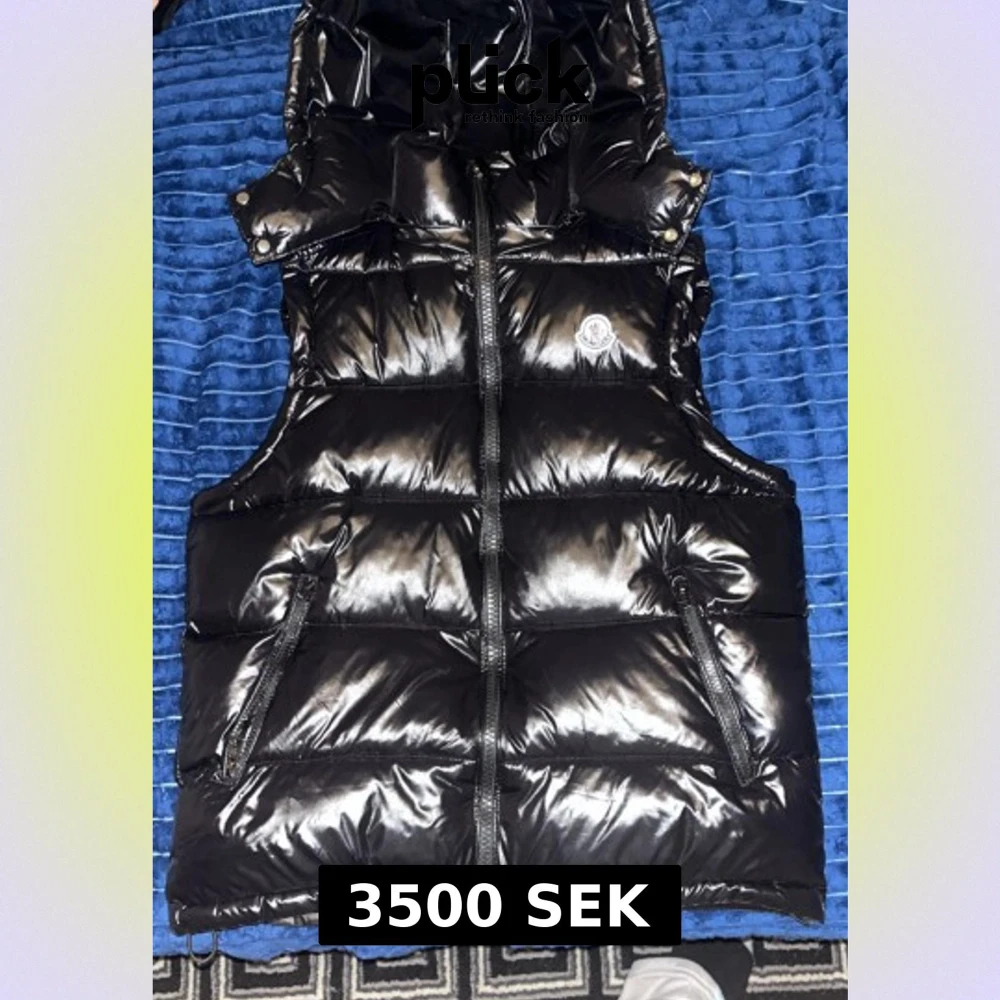Svart glansig pufferväst från Moncler med huva och två dragkedjeförsedda fickor. Västen har en quiltad design och Moncler-logga på bröstet. Perfekt för att ge din outfit en lyxig vibe och hålla dig varm under kyliga dagar.