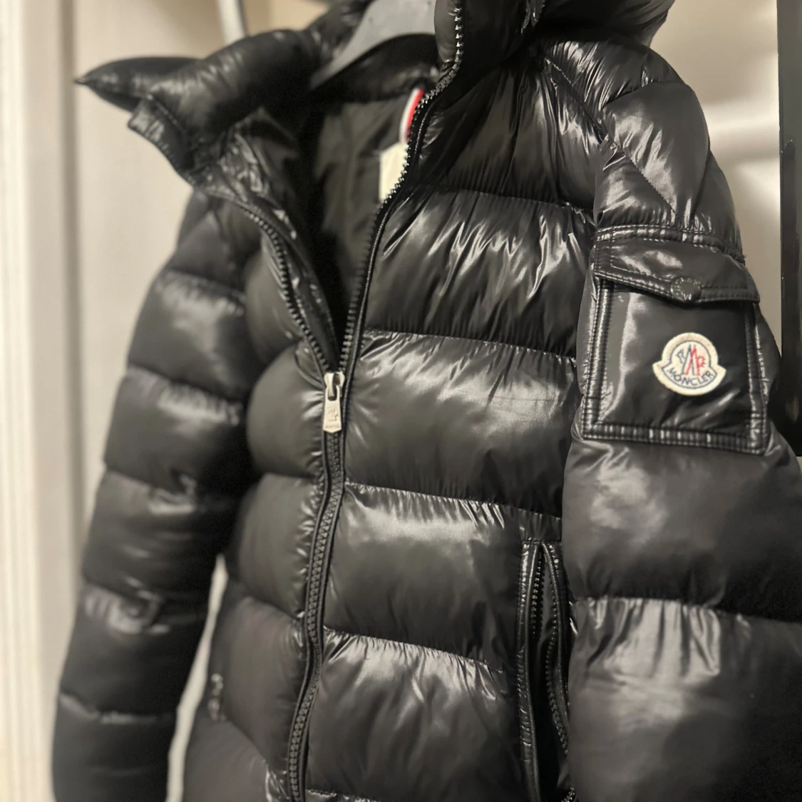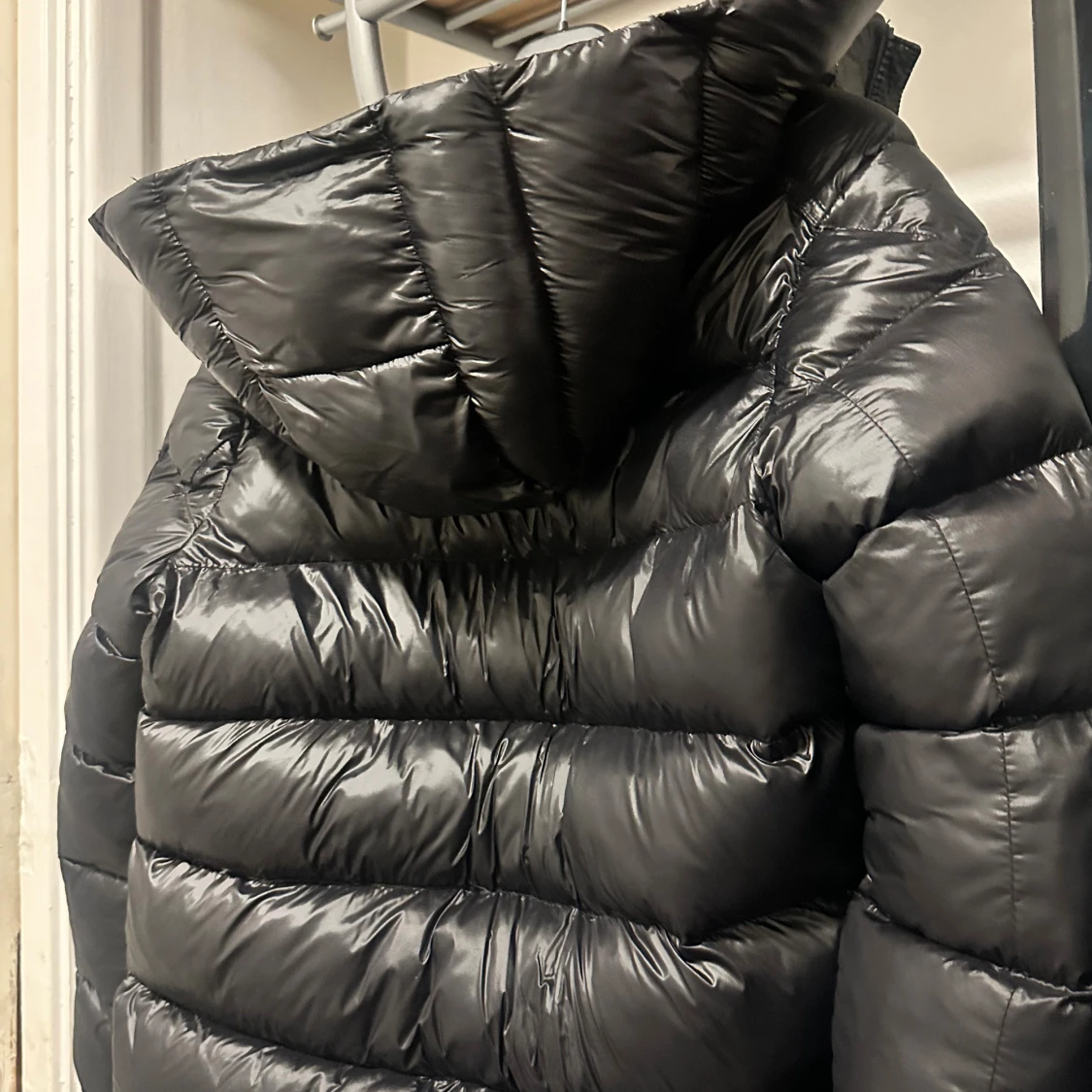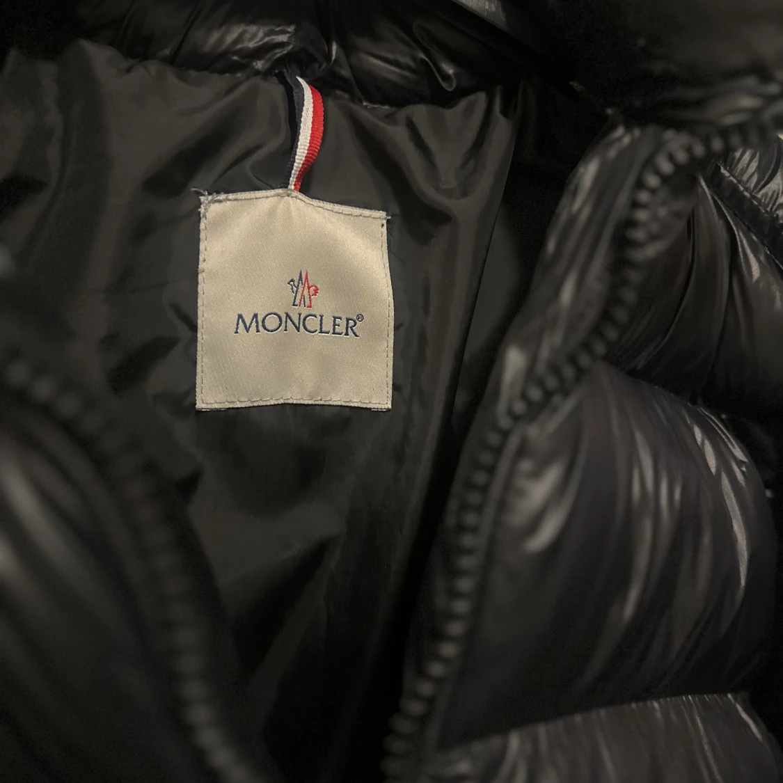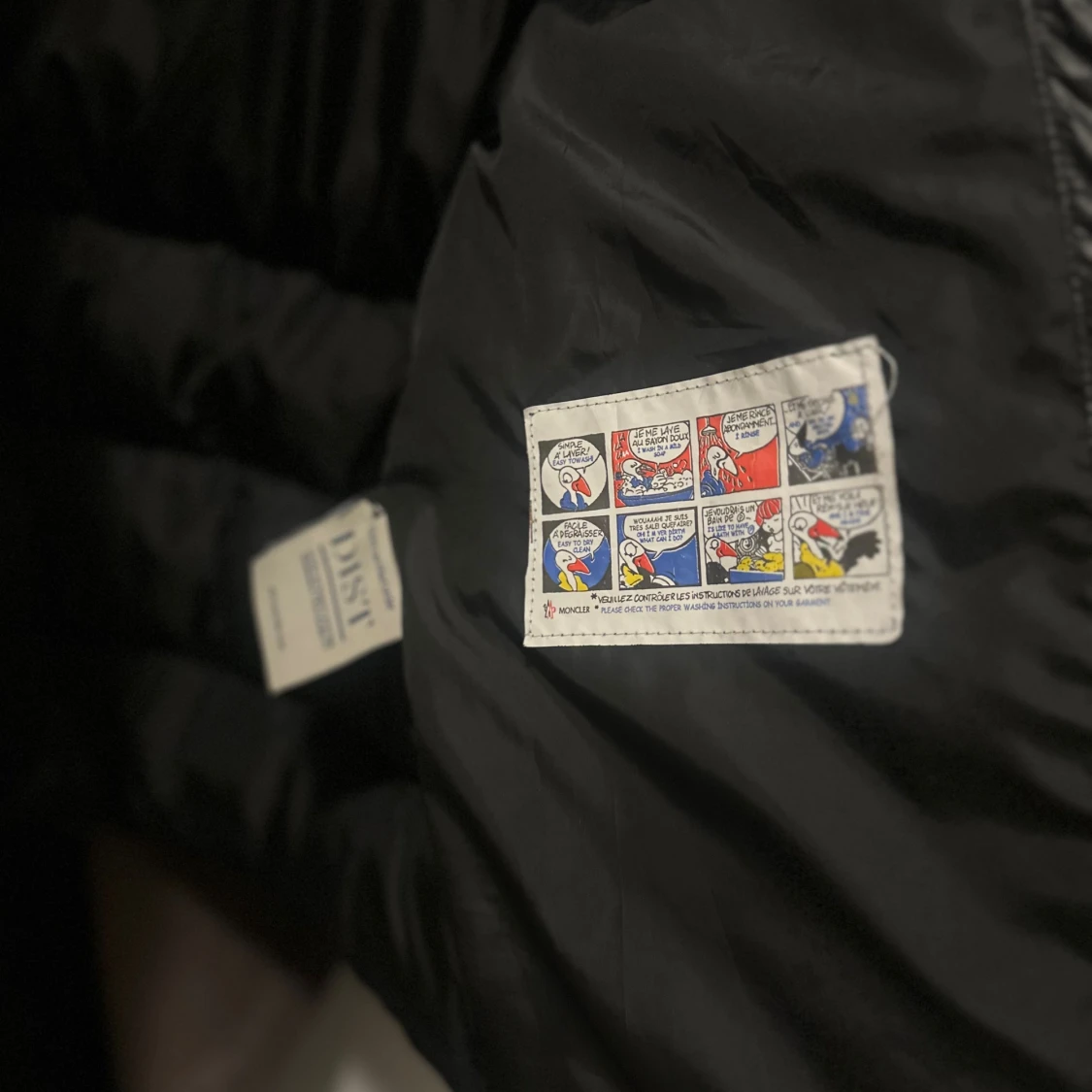 Säljer en svart pufferjacka från Moncler med ikonisk logga på ärmen och stor huva. Jackan har blanka paneler, dragkedja framtill och en ficka på ärmen. Insidan har ett coolt serietidningsmönster på etiketten. Perfekt för kalla dagar.