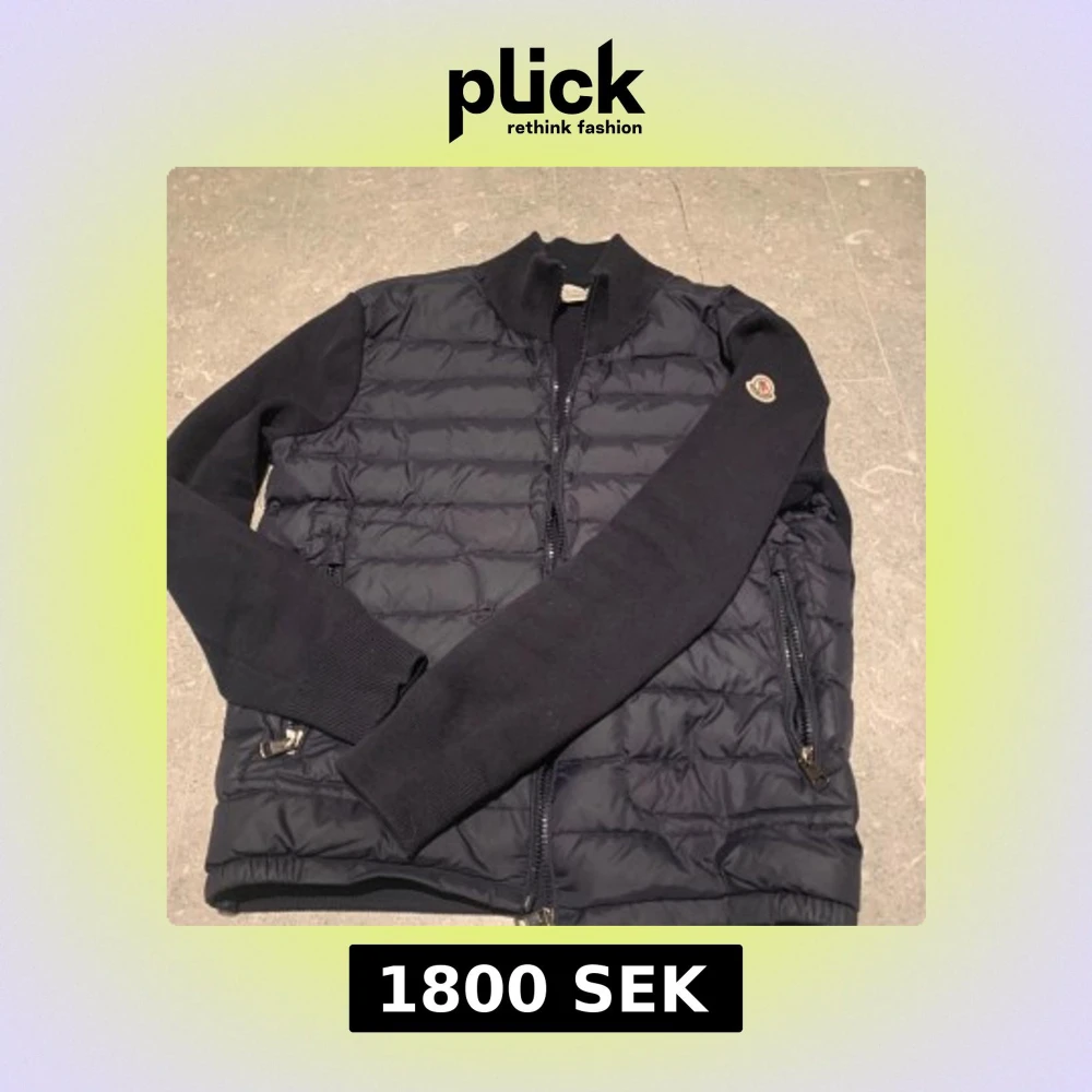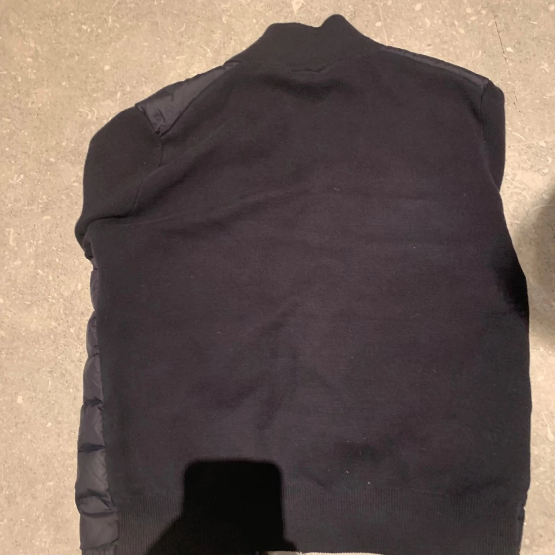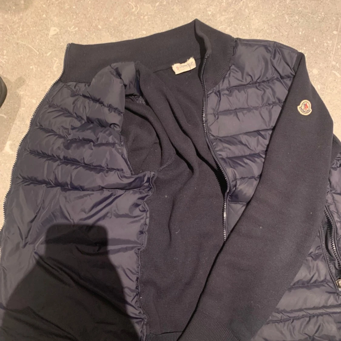 Säljer en snygg mörkblå cardigan från Moncler med quiltad design och dragkedja. Jackan har långa ärmar och en ribbad krage. Perfekt för kyligare dagar. Säljer eftersom att den inte passar längre.