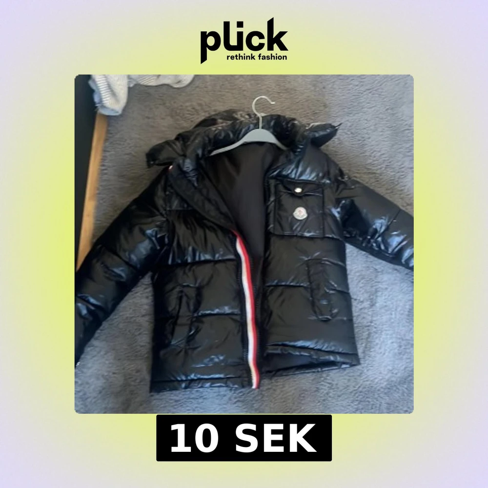 Säljer en svart pufferjacka från Moncler med huva och dragkedja framtill. Jackan har en ficka med knapp på bröstet och Moncler-logga. Klassisk glansig finish och quiltad design.
