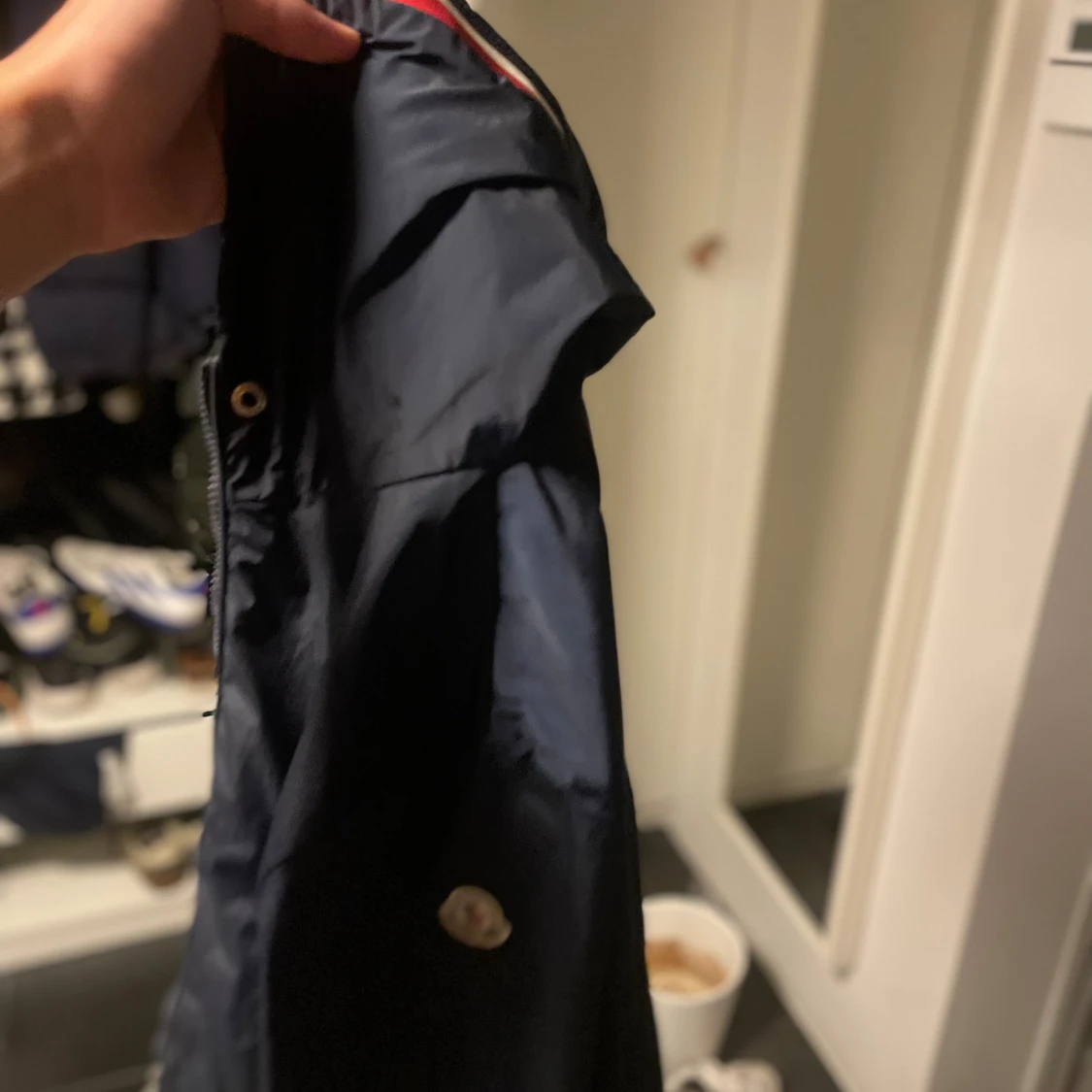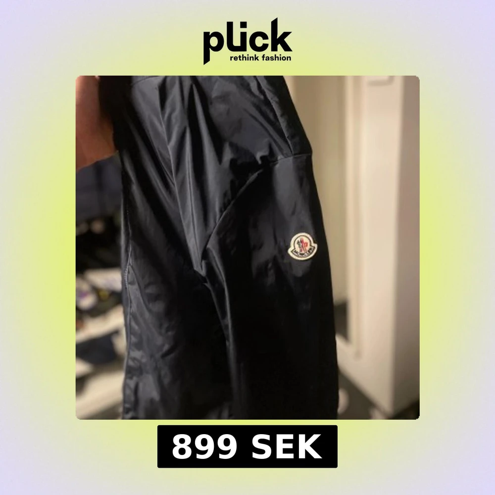 Snygg svart vindjacka från Moncler med klassisk logga på ärmen. Jackan har dragkedja framtill och är tillverkad i ett lätt och glansigt syntetmaterial. Perfekt för dig som vill ha en stilren och sportig look.