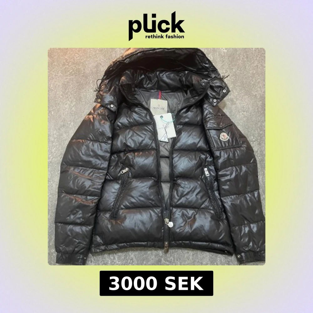 Svart pufferjacka från Moncler med huva och dragkedja framtill. Jackan har två snedställda fickor med dragkedja och en extra ficka med Moncler-logga på ärmen. Materialet är glansigt och jackan är quiltad för extra värme.