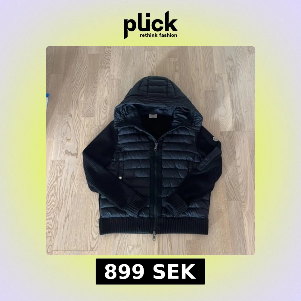 Svart cardigan från Moncler med quiltad front och huva. Ärmarna är stickade för en schysst kontrast och jackan har dragkedja framtill. Perfekt för kyliga dagar när du vill ha både stil och värme. Klassisk Moncler-logga på ärmen.