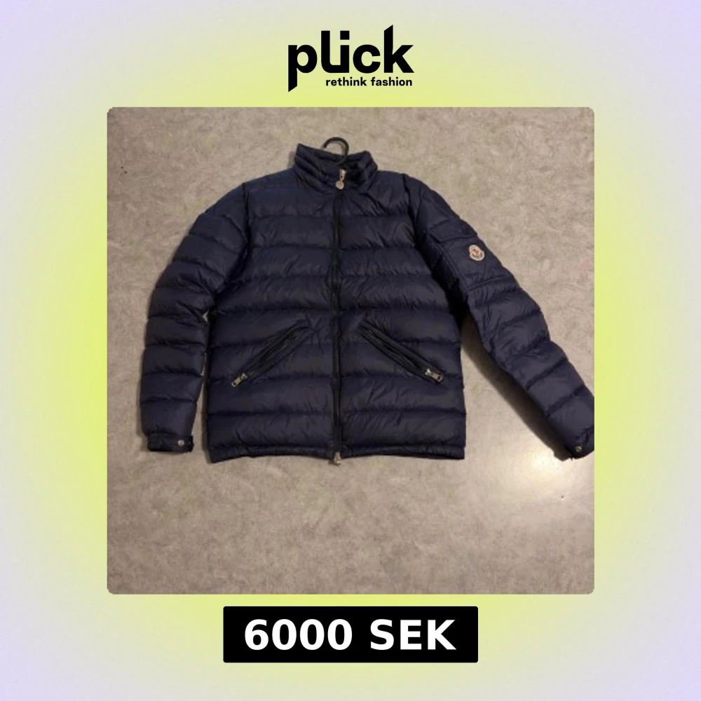 Snygg mörkblå dunjacka från Moncler med klassisk logga på ärmen. Jackan har två snedställda fickor med dragkedja, hög krage och quiltad design. Perfekt för kyliga dagar och riktigt stilren look.