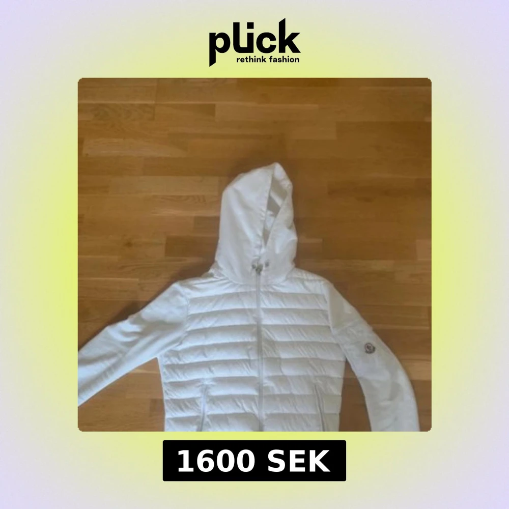 Säljer en snygg vit quiltad jacka från Moncler med dragkedja och huva. Jackan har ett stilrent märke på ärmen och är perfekt för kyligare dagar. Den är både praktisk och trendig, idealisk för dig som vill hålla stilen under våren och sommaren. Möts bara upp i Stockholm eller Uppsala.