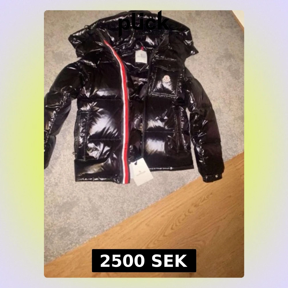 Säljer en svart, glansig pufferjacka från Moncler med huva och coolt rött och vitt band längs dragkedjan. Jackan har en bröstficka med Moncler-logga, flera dragkedjefickor och quiltad design. Perfekt för dig som vill ha en snygg och varm jacka med streetkänsla. Pris kan diskuteras