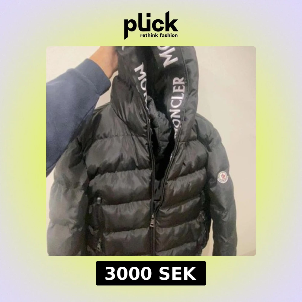 Säljer en snygg svart pufferjacka från Moncler med broderad logga på ärmen. Jackan har en hög krage och dragkedja framtill. Perfekt för kyliga dagar med sin stilrena design och varma material.