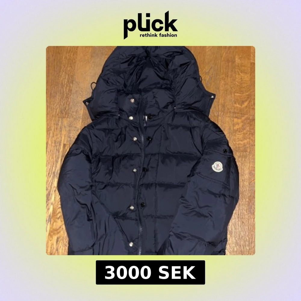 Säljer en mörkblå dunjacka från Moncler med huva och klassisk logga på ärmen. Jackan har quiltad design, dragkedja och knappar framtill. Perfekt för kalla dagar och har en snygg, puffig look som sticker ut. Fodrad insida med Moncler-etikett och serietidningsdetalj.