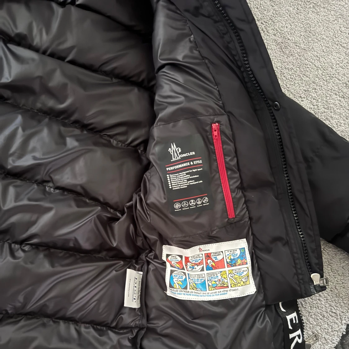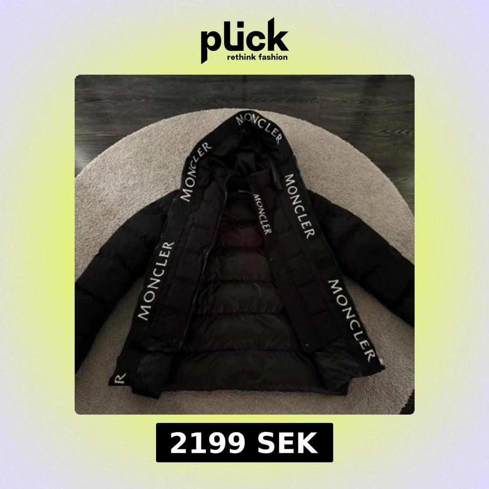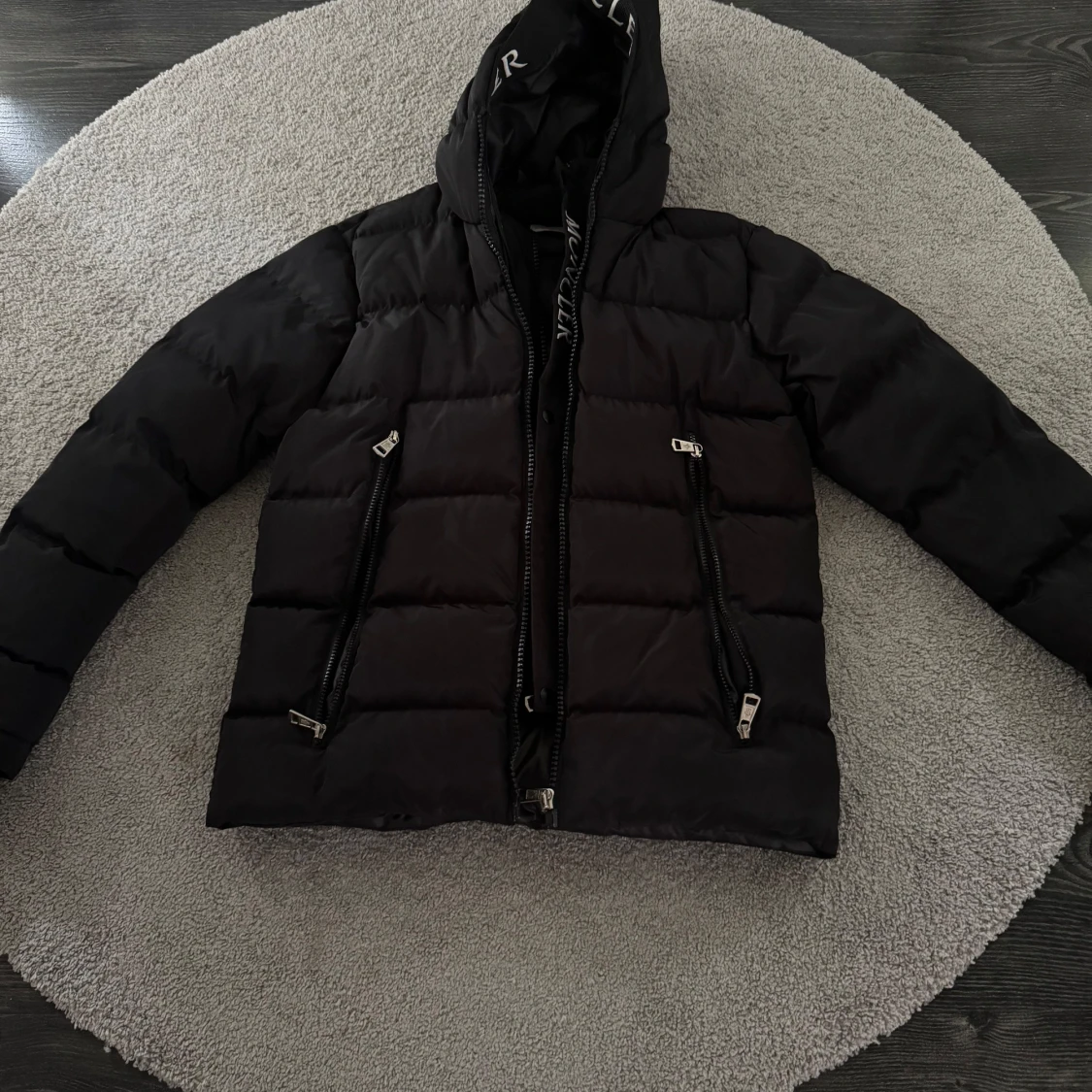 Säljer en svart dunjacka från Moncler med stor huva och tydlig logga längs kanterna. Jackan har dragkedja framtill och två snedställda fickor med dragkedja. Perfekt för kalla dagar och riktigt snygg streetstil.Absolut Nyskick endast testad. Storlek S säljer den för jag vill köpa en annan istället