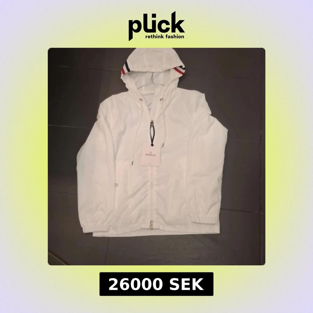 Helt ny oanvänd finns med förpackning. Snygg vit vindjacka från Moncler med huva och snörning. Jackan har dragkedja framtill, Moncler-logga på ärmen och diskreta rödblå detaljer på huvan. Perfekt för dig som gillar stilrena och sportiga plagg. Materialet är lätt och känns fräscht.