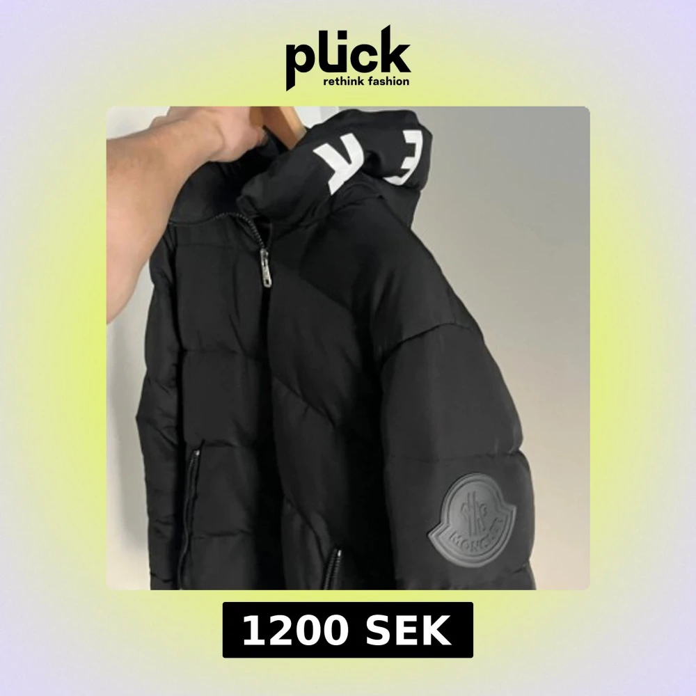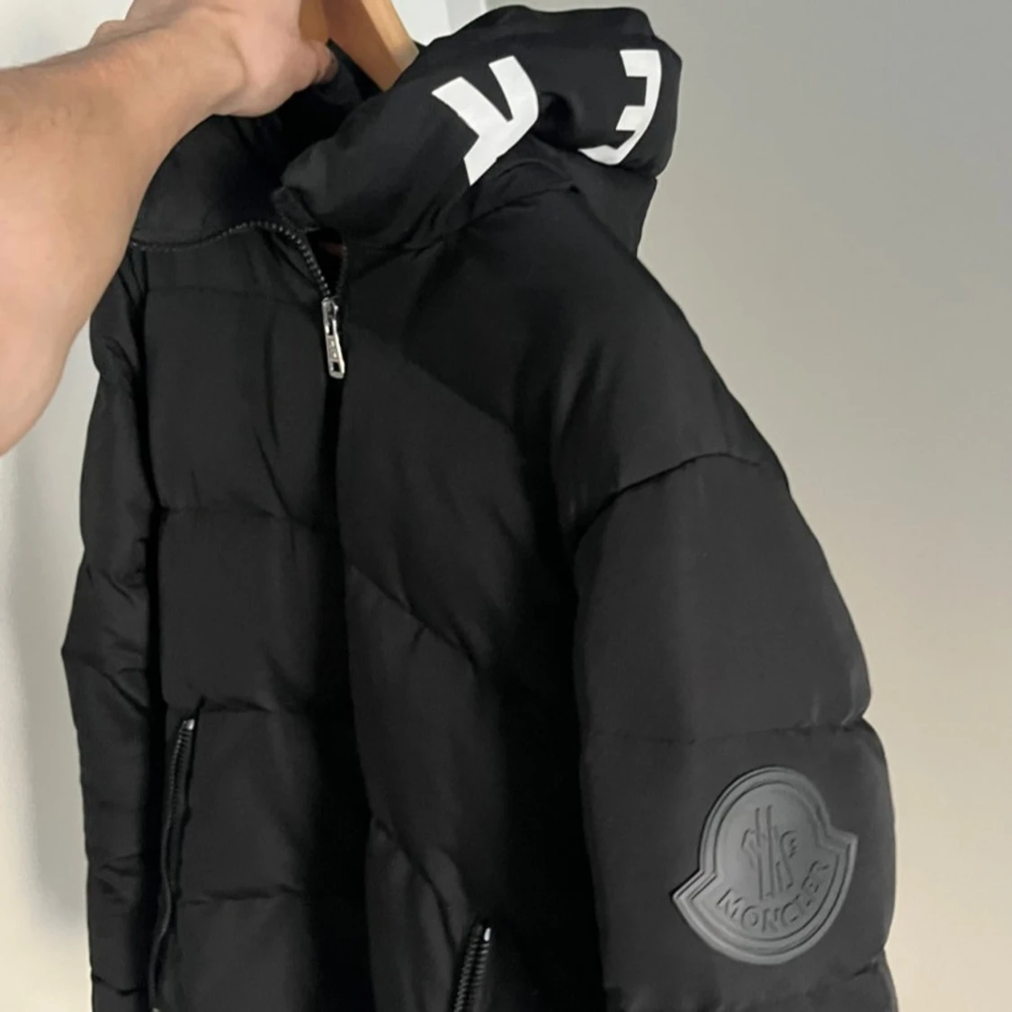 Svart pufferjacka från Moncler med stor huva och vit logotyptext. Helt ny (oanvänd). Skriv vid funderingar! S
