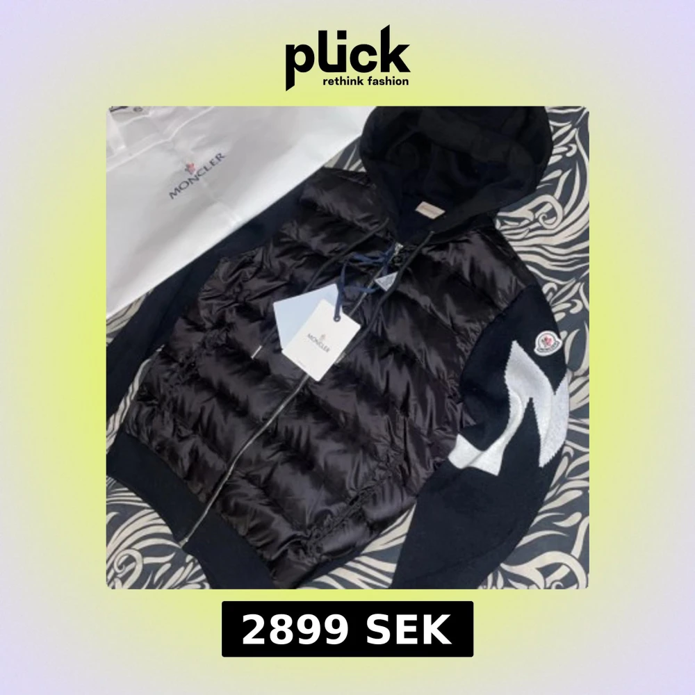 Snygg svart pufferjacka från Moncler med huva och dragkedja. Jackan har quiltad framsida i glansigt material, stickade ärmar med vit detalj och Moncler-logga på ärmen. Perfekt för dig som vill ha en stilren och exklusiv look. Kan passa kille storlek S-M
