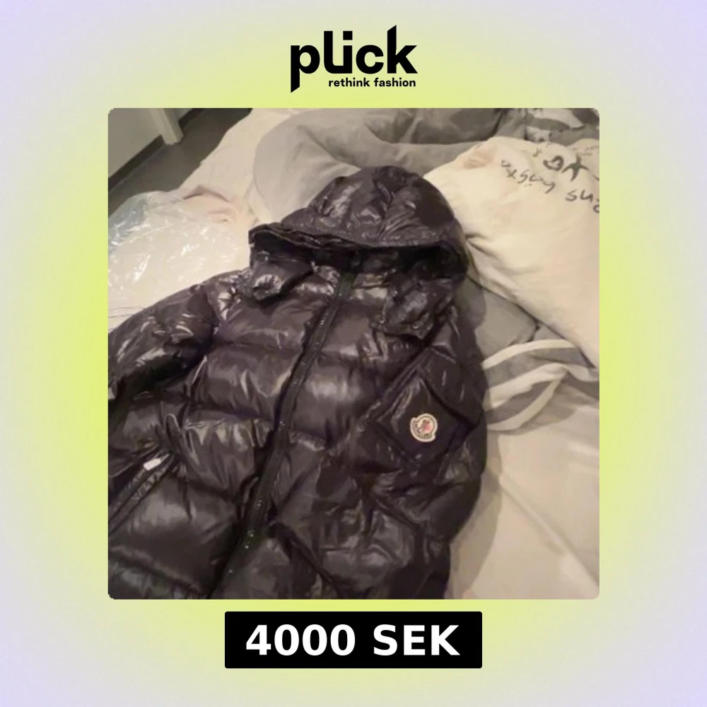 Säljer en snygg svart dunjacka från Moncler med huva och dragkedja. Jackan har ett glansigt yttre och Moncler-logga på ärmen. Perfekt för kyliga dagar.