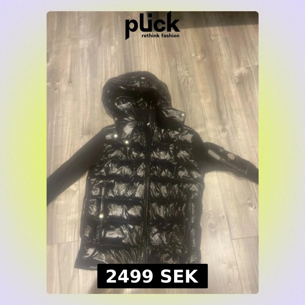 Svart pufferjacka från Moncler med glansig yta och huva. Jackan har quiltad front och ärmar i mjukt tyg, samt en ficka med Moncler-logga på ena ärmen. Dragkedja framtill och coolt serietidningsmärke på insidan. Perfekt för dig som vill ha en snygg och varm jacka.
