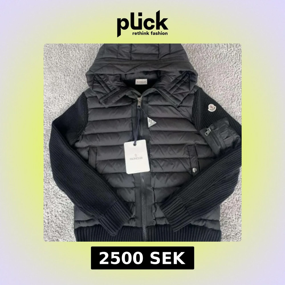 Snygg svart dunväst från Moncler med huva och dragkedja. Västen har stickade detaljer på sidorna och ärmarna, samt Monclers logotyp på ärmen. Perfekt för en kyligare sommardag