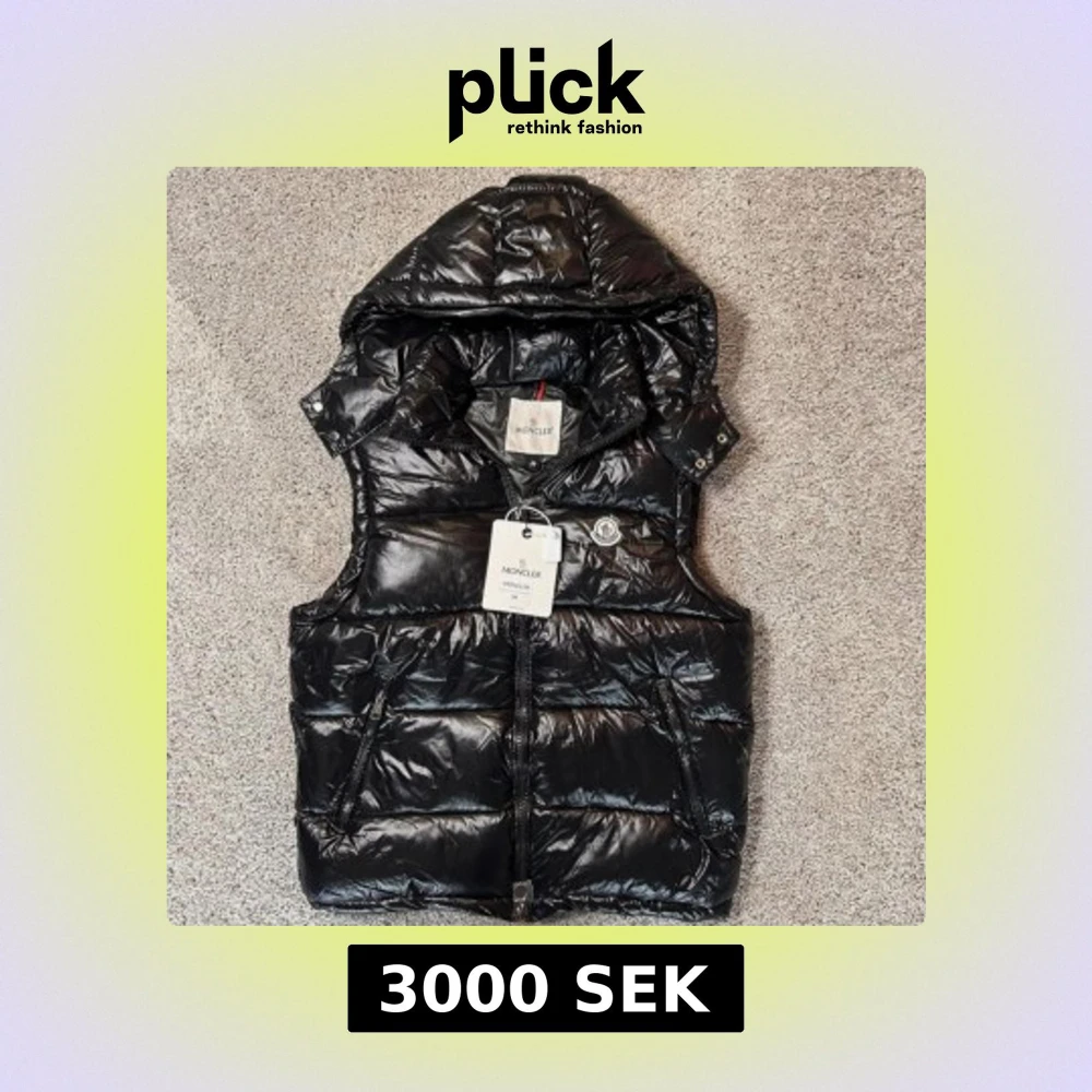 Snygg svart dunväst från Moncler med glansig finish och huva. Den är endast provad alla lappar är kvar - kan bytas mot förslag