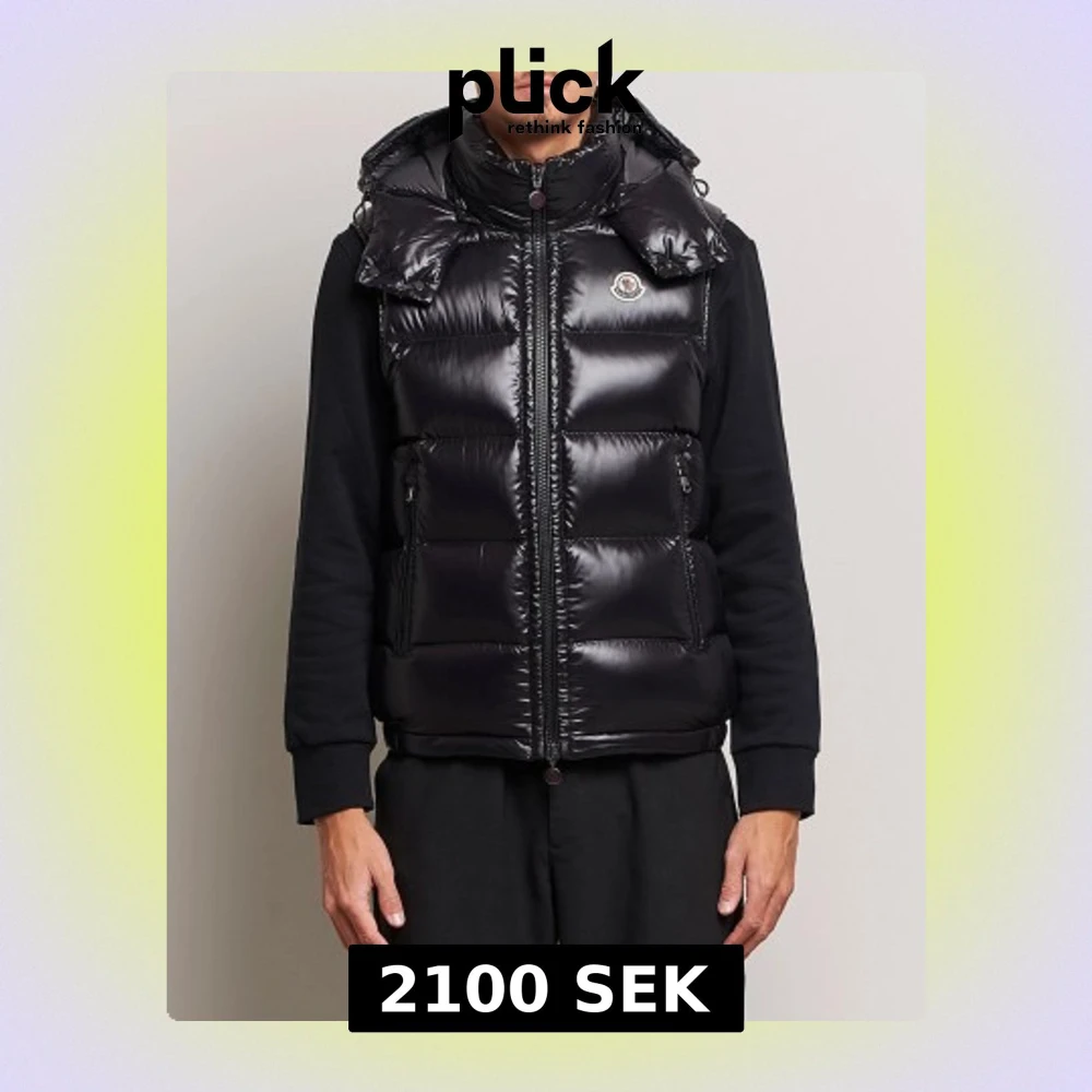 Snygg svart dunväst från Moncler med glansig finish och ikonisk logga på bröstet. Västen har en quiltad design, hög krage och dragkedja framtill. Perfekt att slänga över en hoodie för extra värme. Stilsäker och tidlös look.
