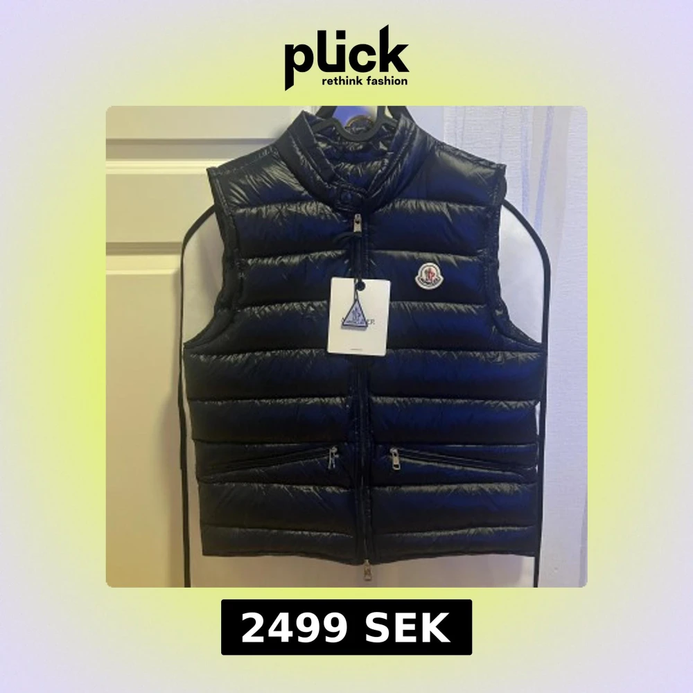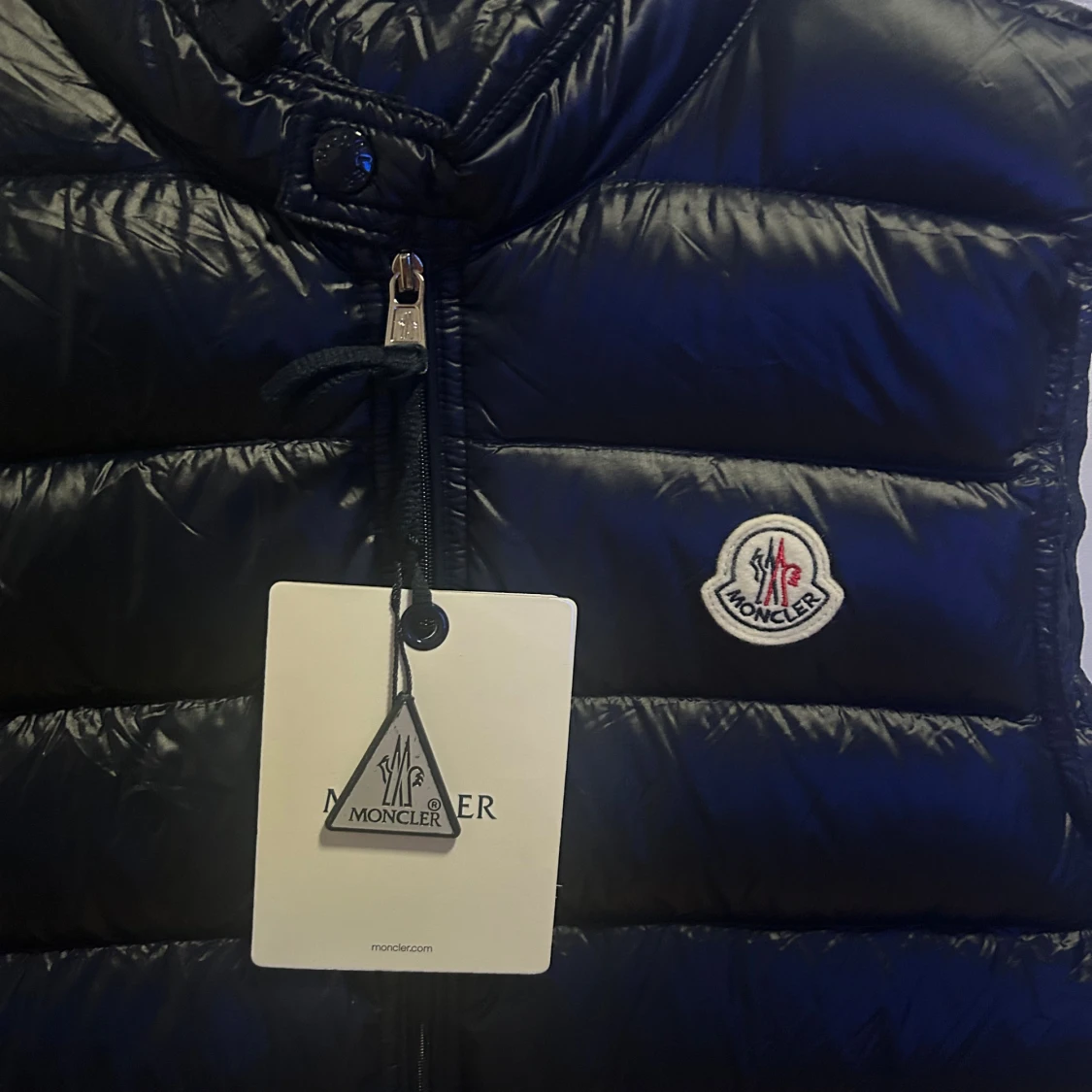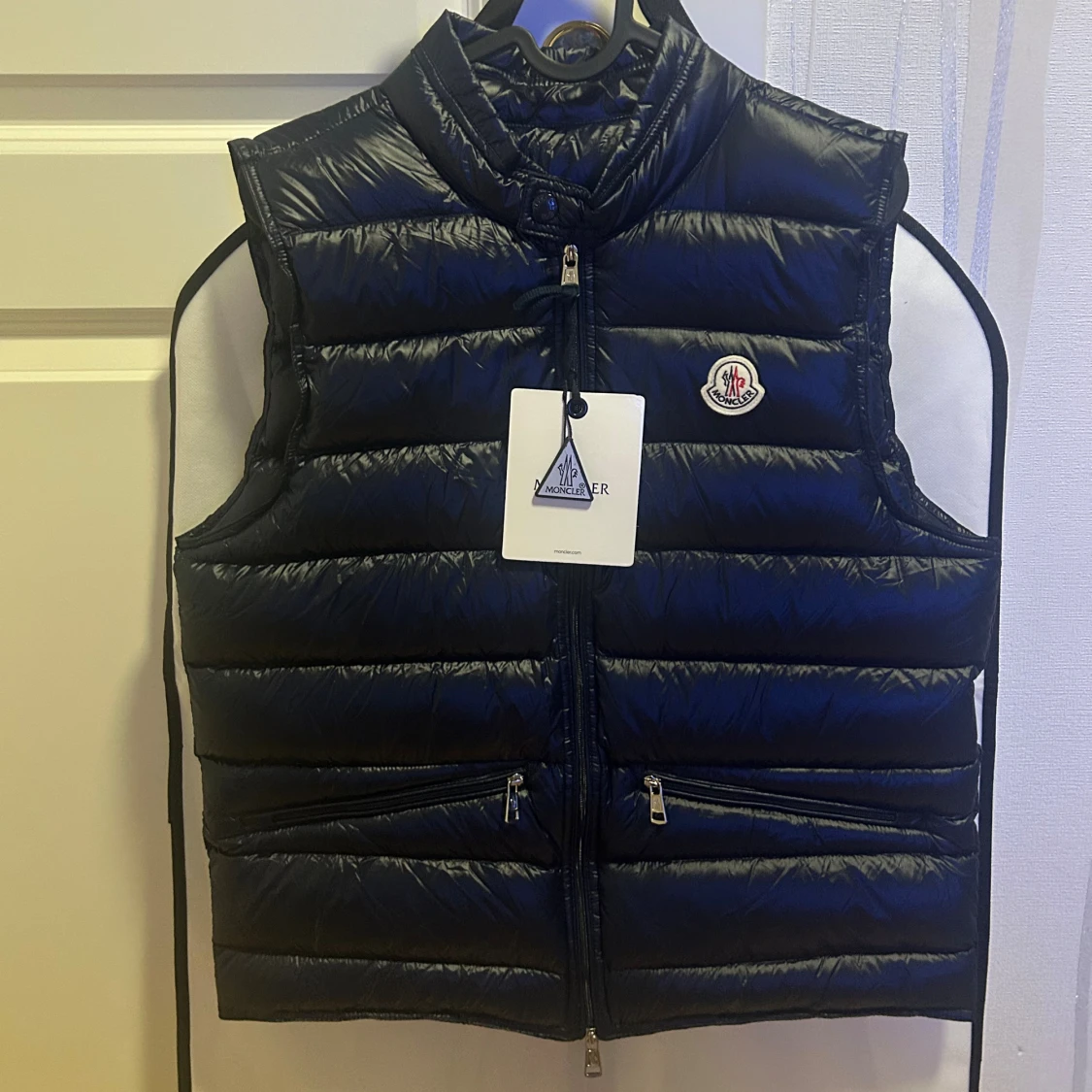 Snygg mörkblå dunväst från Moncler med klassisk quiltad design, hög krage och dragkedja framtill. Västen har två fickor med dragkedja och ikonisk Moncler-logga på bröstet. Perfekt för lager-på-lager och stilren look.