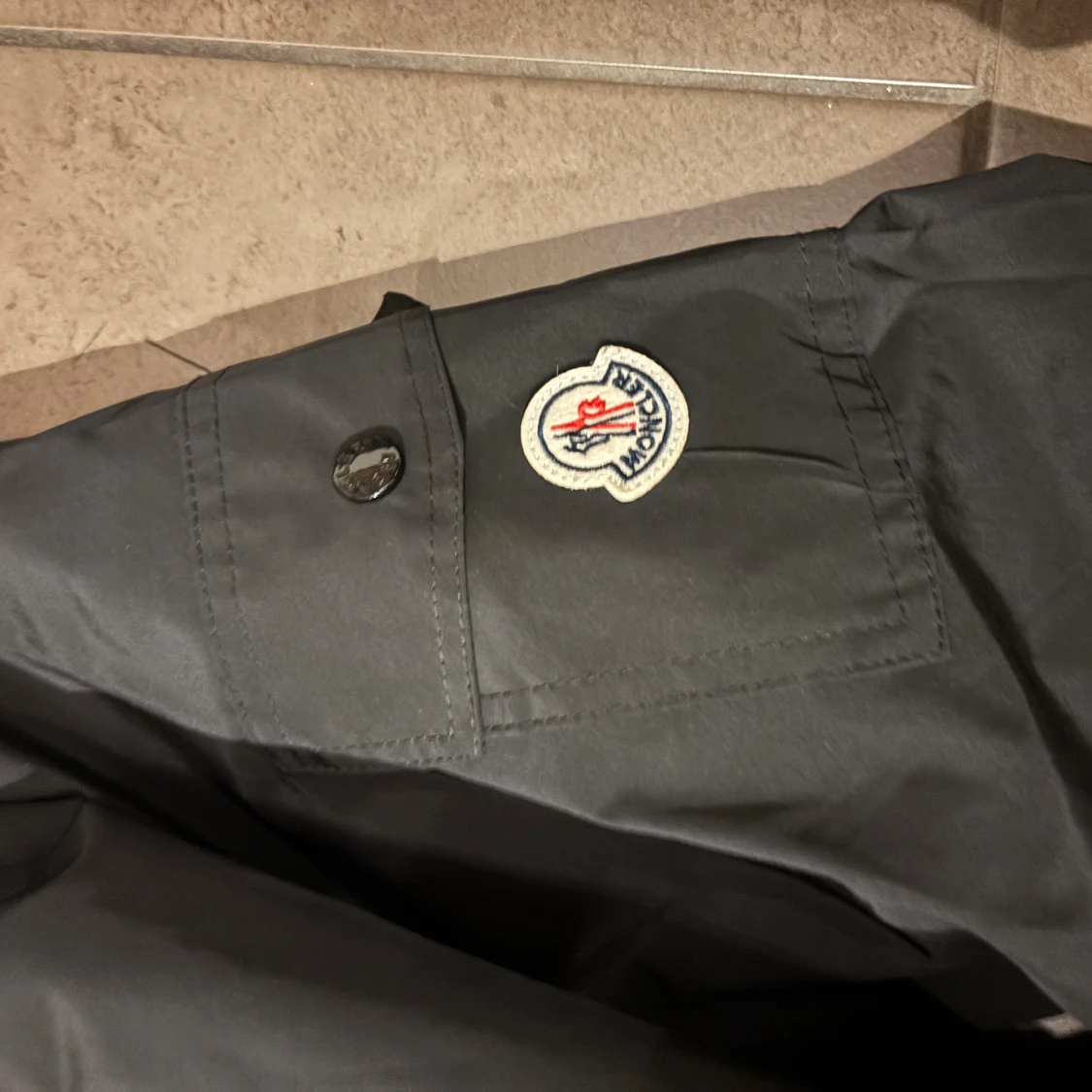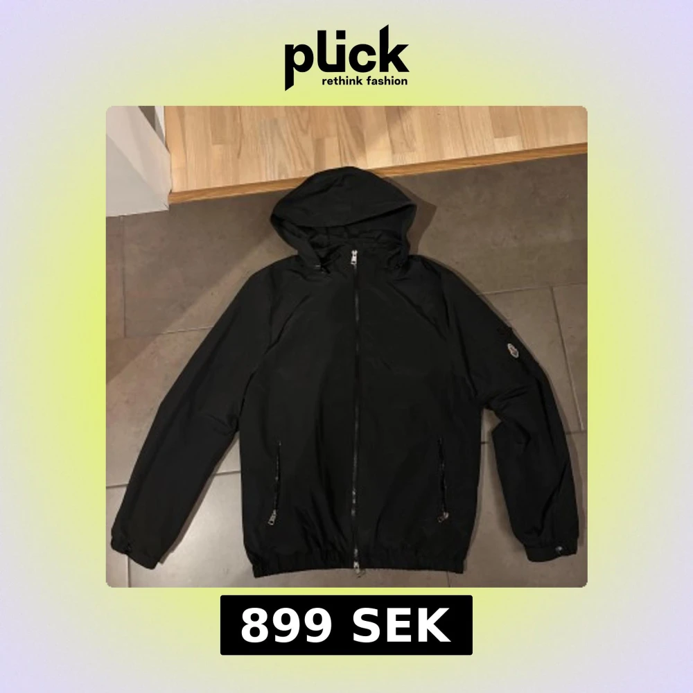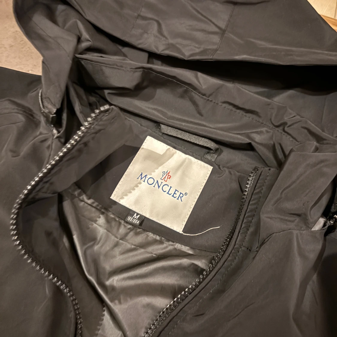 Svart vindjacka från Moncler med huva, hel dragkedja och två fickor med dragkedja framtill. Jackan har elastiska muddar och nederkant samt Moncler-logga på ärmen. Lätt och smidig jacka i syntetmaterial, perfekt för blåsiga dagar. Ny skick och tagen finns kvar