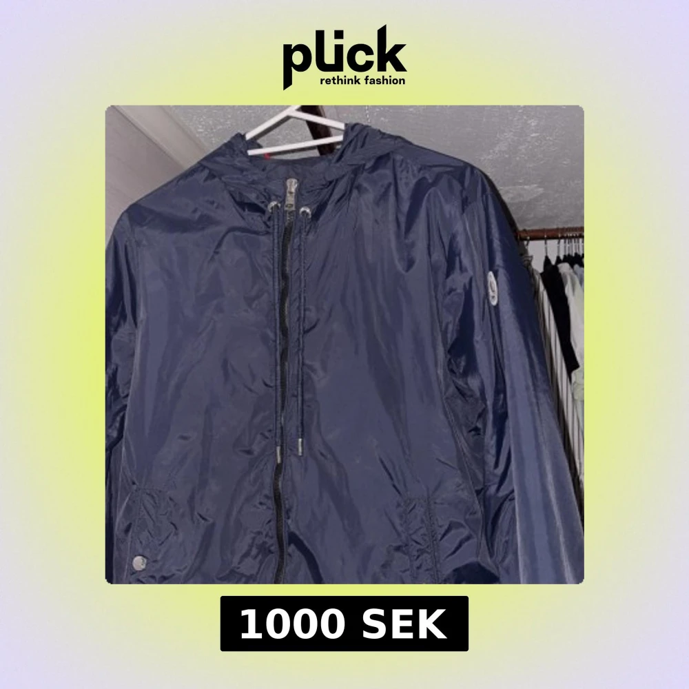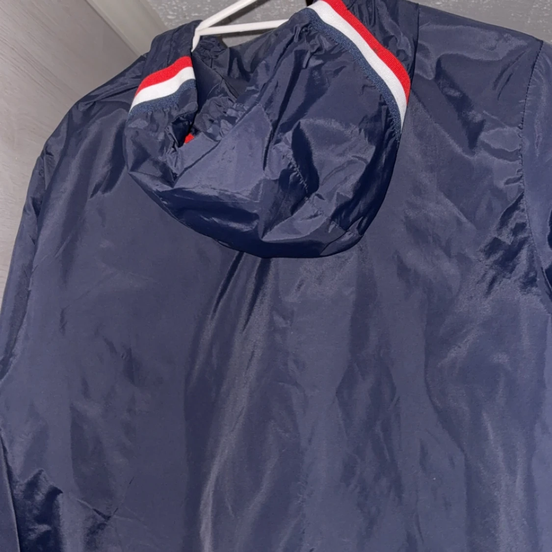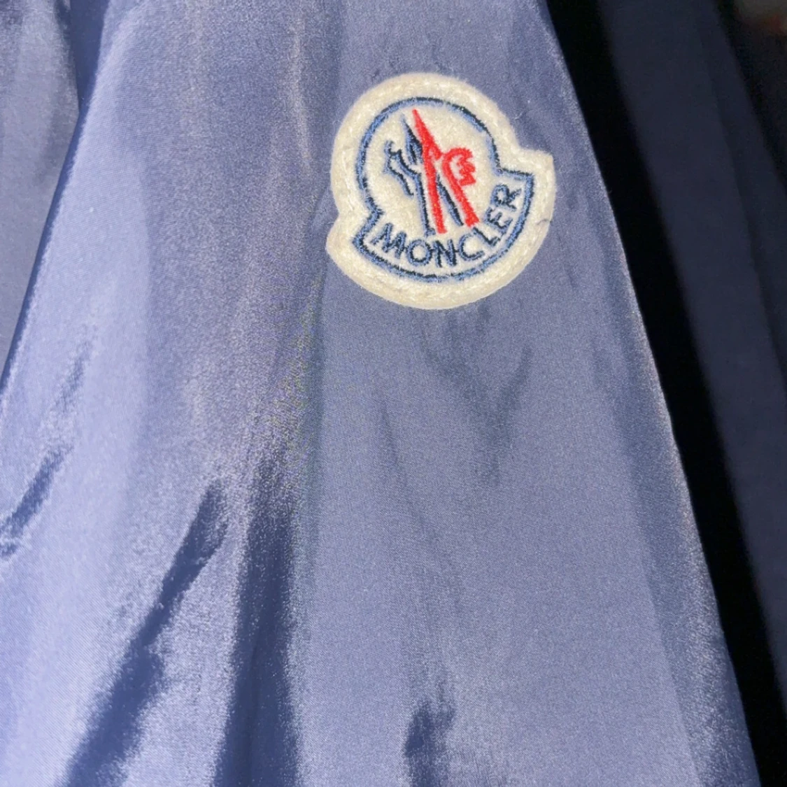 Snygg mörkblå vindjacka från Moncler med dragkedja och huva. Jackan har Moncler-logga på ärmen och röd-vit-blå randdetalj på huvan.