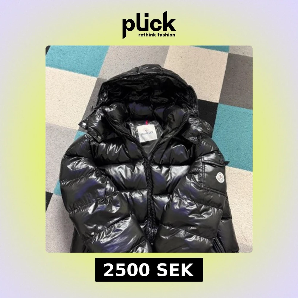 Svart glansig pufferjacka från Moncler med huva och dragkedja. Jackan har Moncler-logga på ärmen och praktiska fickor med knappstängning. Perfekt för kalla dagar och har en riktigt snygg streetstil.