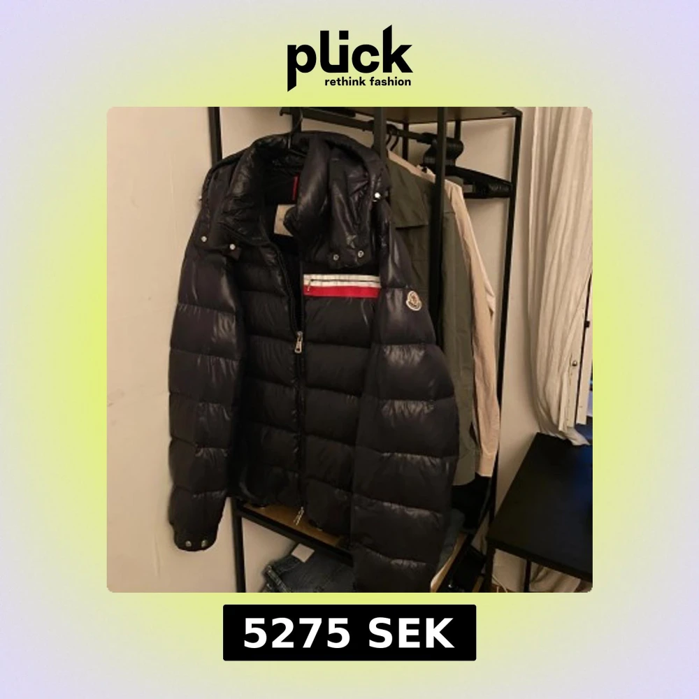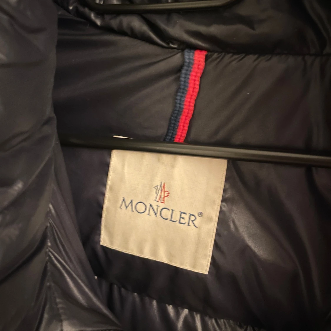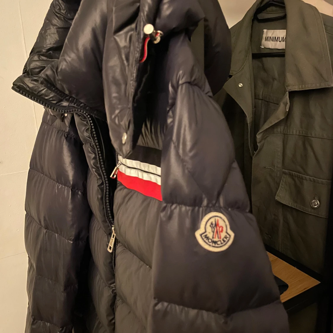 Säljer en mörkblå dunjacka från Moncler med avtagbar huva och snygga detaljer i rött och vitt på bröstet. Jackan har Moncler-logga på ärmen, dragkedja framtill och quiltad design som ger en schysst puffer-look. Perfekt för kalla dagar!