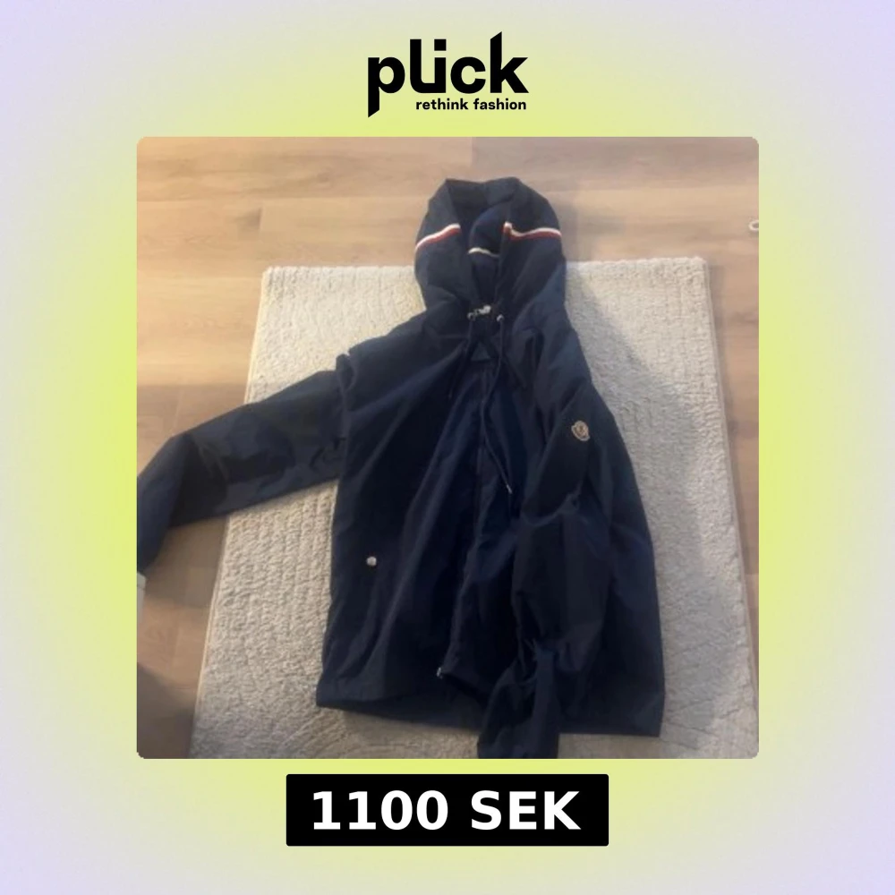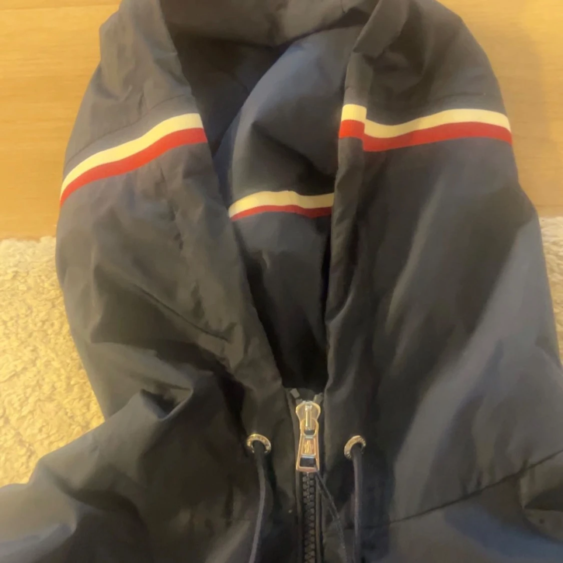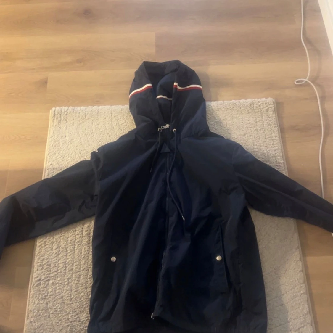 Säljer en mörkblå vindjacka med huva och dragkedja. Jackan har vita och röda ränder på huvan och dragsko vid halsen. Perfekt för blåsiga dagar!. Storlek 4 så L/M
