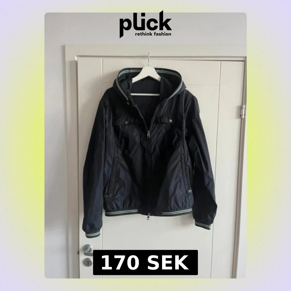 Givetvis äkta Svart vindjacka med huva och dragkedja framtill. Jackan har ribbade muddar med vita och gröna ränder, samt fickor med knappstängning på bröstet. Perfekt för blåsiga dagar och har en sportig look. Intressekoll