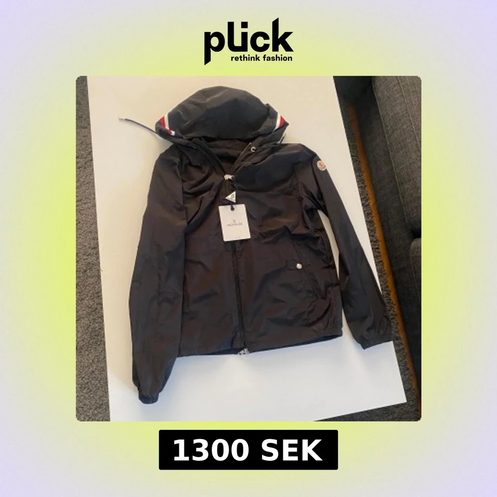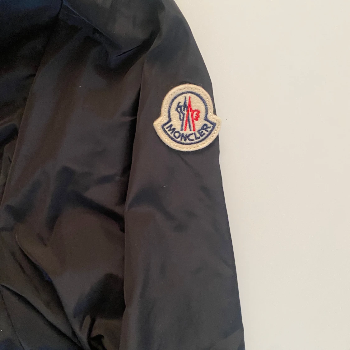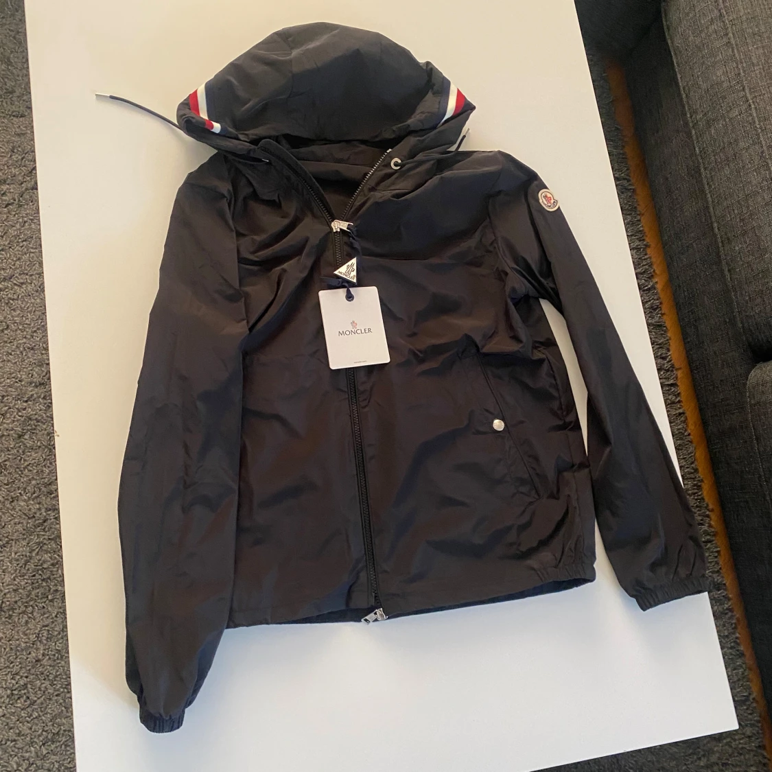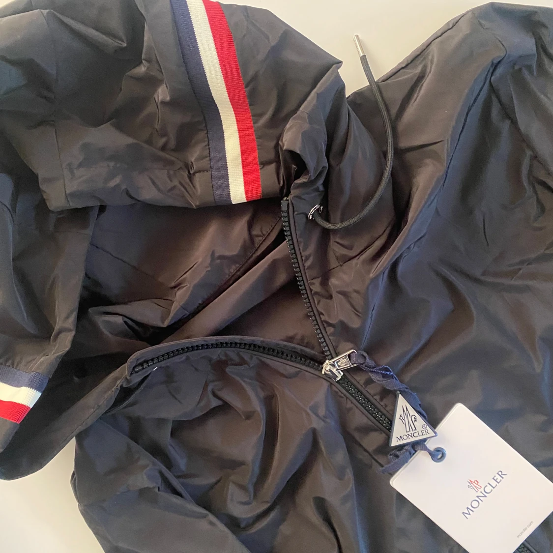 Snygg svart vindjacka från Moncler med huva och dragkedja. Jackan har Moncler-logga på ärmen och detaljer i rött, vitt och blått på huvan. Perfekt för blåsiga dagar.