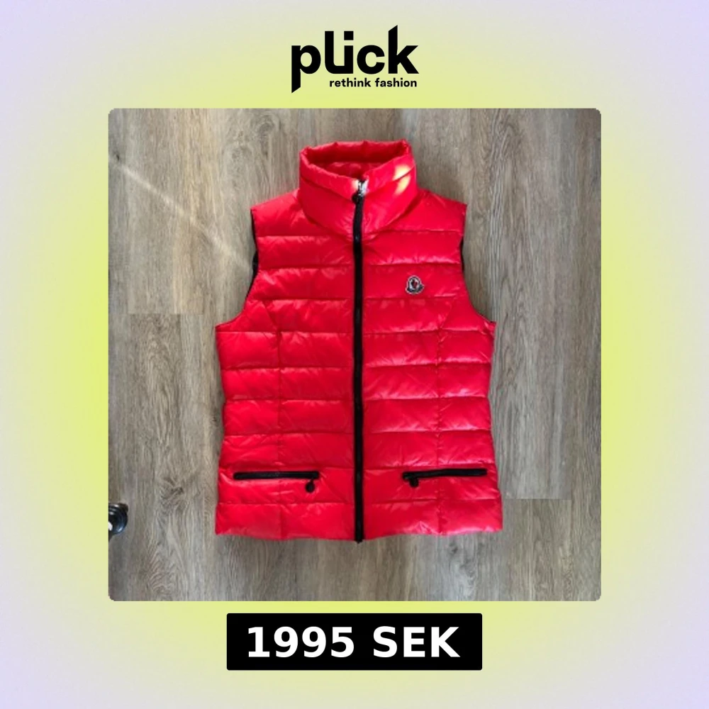 Snygg röd dunväst från Moncler med hög krage, svarta dragkedjor och broderad logga på bröstet. Västen har två fickor framtill med dragkedja och quiltad design. Två små ytterfickor. Går att sätta på ett elastiskt band för midjan som medföljer. Modellen är från 2008-2012.
