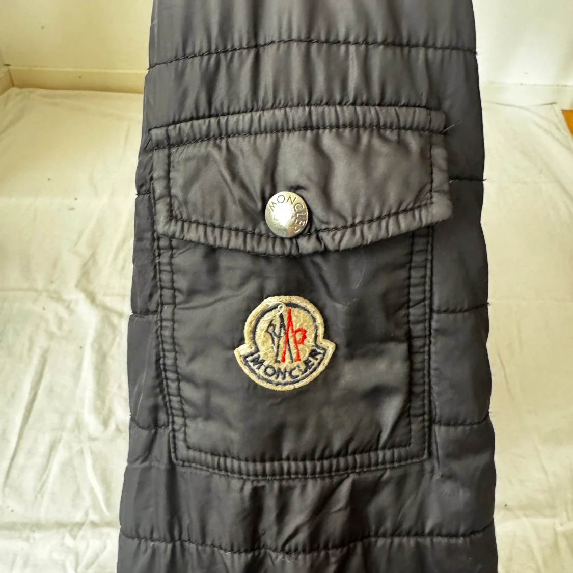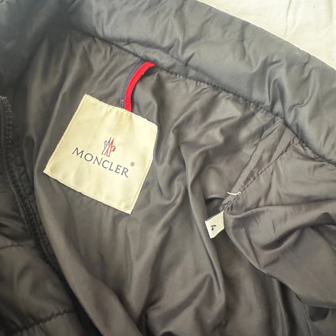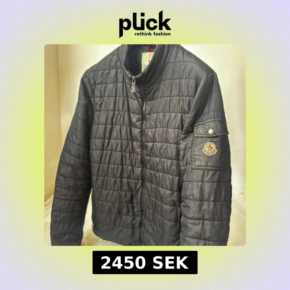 Svart quiltad pufferjacka från Moncler med klassisk logga på ärmen och dragkedja framtill. Jackan har hög krage, ficka med knapp på ärmen och diskreta horisontella sömmar. Perfekt för dig som vill ha en stilren och varm jacka med exklusiv känsla. ( den har ett litet brännmärke som knappt är synligt finns på sista bilden) storlek 4/XL