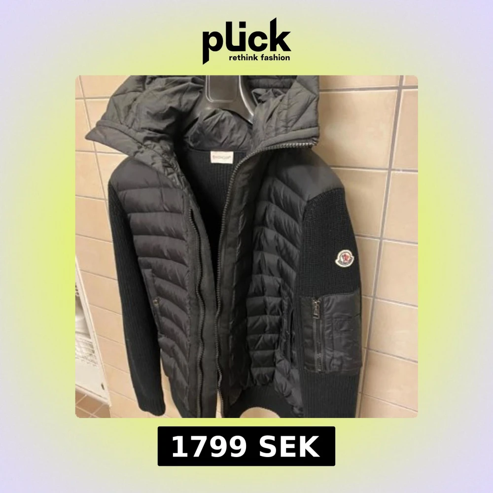 Snygg svart dunväst från Moncler med stickade ärmar och dragkedja framtill. Västen har en quiltad design och en praktisk huva. Perfekt för våren! Mindre i storlekarna då det är så passformen är för dessa jackor.
