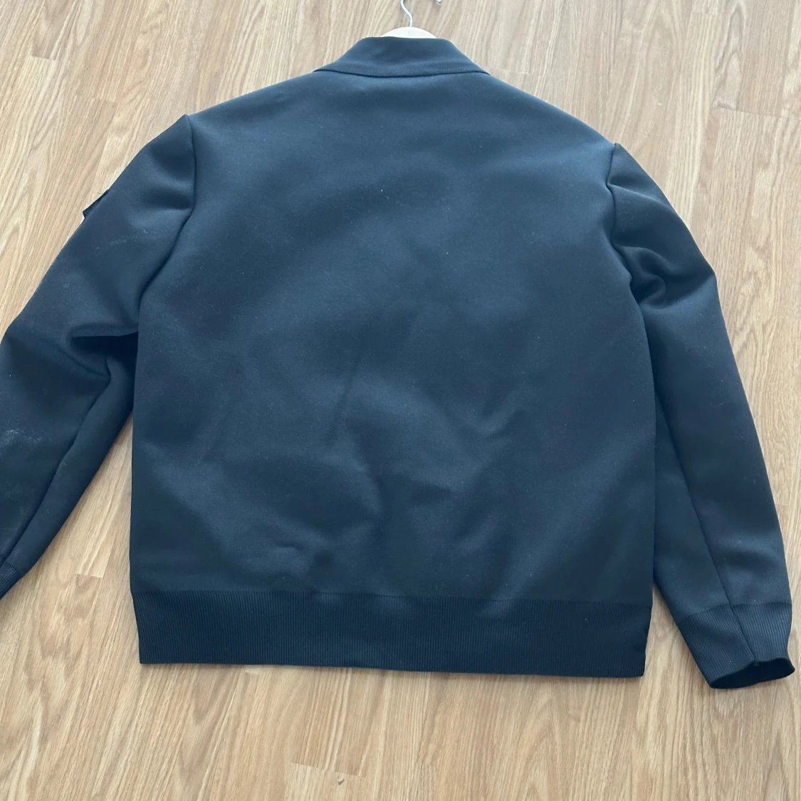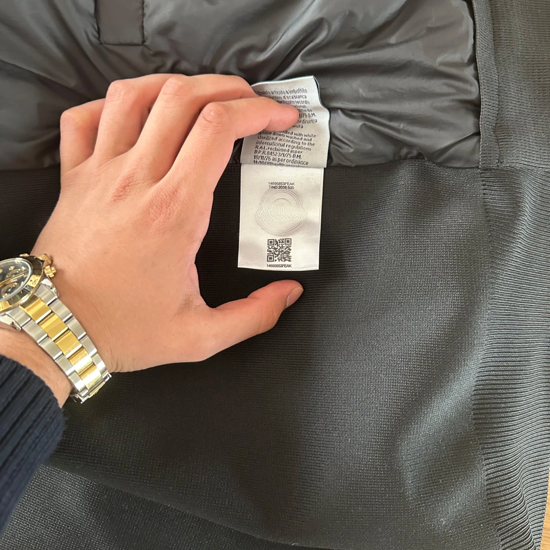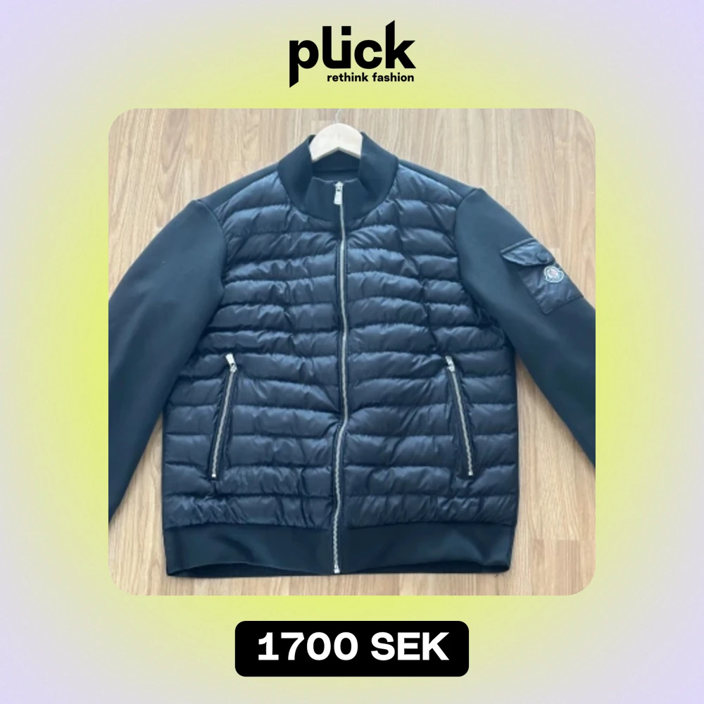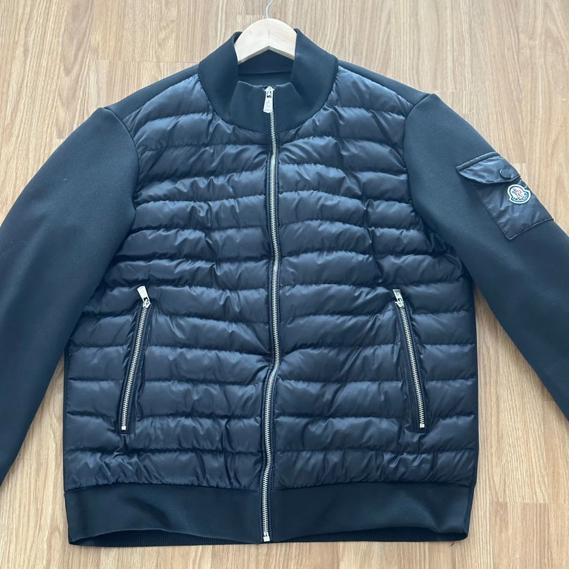 Säljer en snygg svart quiltad jacka från Moncler. Den har en stilren design med dragkedja framtill och två praktiska fickor med dragkedjor. Jackan har långa ärmar och en cool patch på ena ärmen. Perfekt för höst och vår!