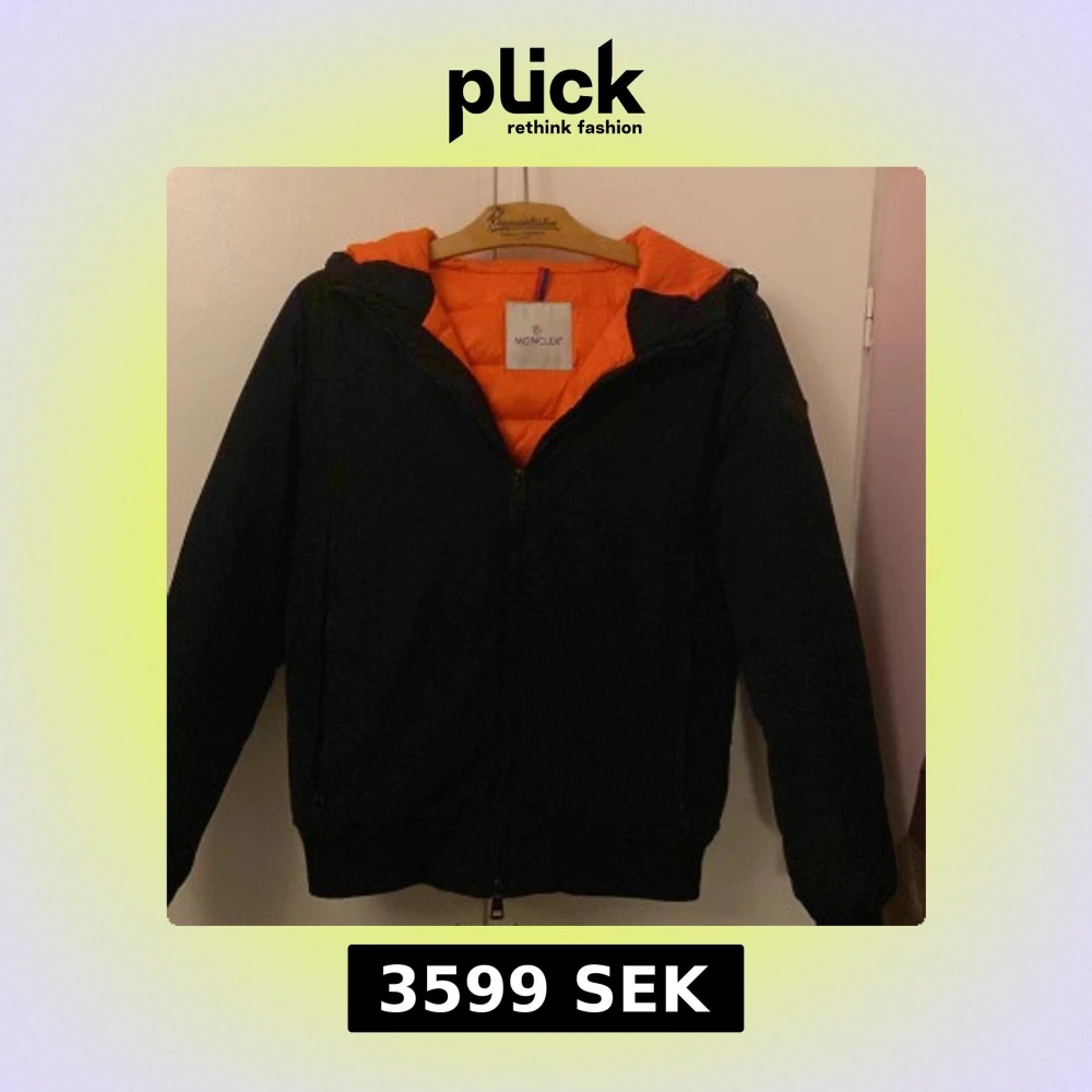 Säljer en svart pufferjacka från Moncler med orange quiltat foder och huva. Jackan har dragkedja framtill och ribbade muddar. Klassisk Moncler-logga på ärmen och snygg kontrast mellan det svarta yttermaterialet och det orange fodret. Perfekt för kalla dagar.