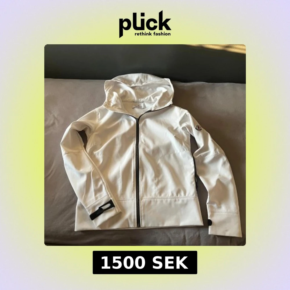 Säljer en stilren vit jacka från Moncler med dragkedja och huva. Jackan har ett Moncler-märke på ärmen och är perfekt för vår och höst. Den har långa ärmar och en modern design.