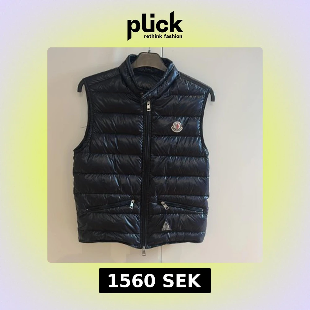 Snygg svart dunväst från Moncler med glansig finish och klassisk logga på bröstet. Västen har ståkrage, två dragkedjefickor fram och quiltad design. Perfekt att slänga över en hoodie för en cool look. Dragkedja framtill och diskreta detaljer.