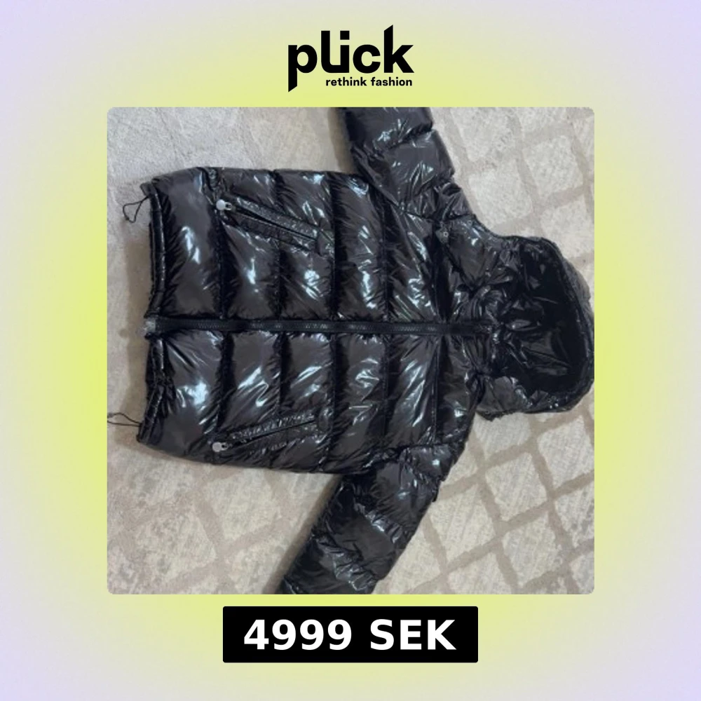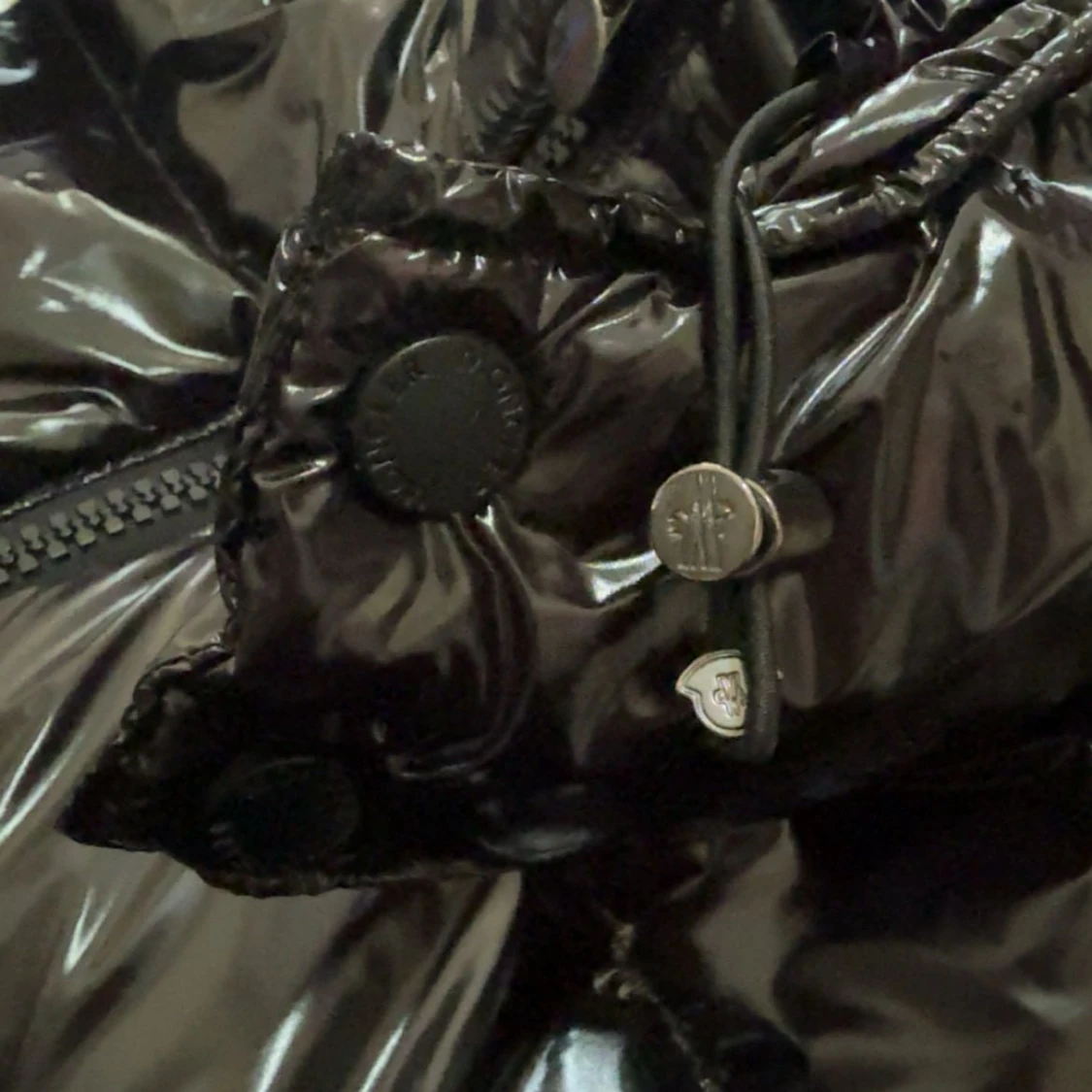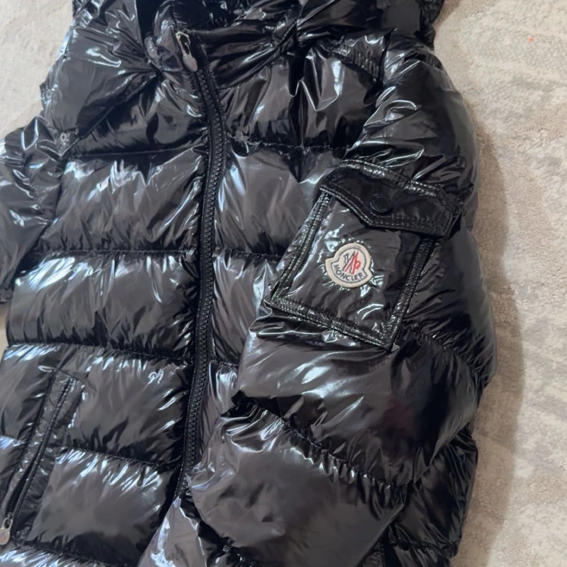Säljer en svart, glansig dunjacka från Moncler med huva och dragkedja framtill. Jackan har flera fickor med dragkedja och Moncler-logga på ärmen. Puffig modell med justerbara snören och snygga detaljer. Perfekt för kalla dagar. Har även NFC TAGG