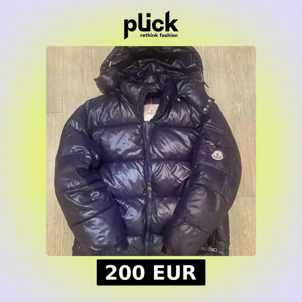 Säljer en mörkblå pufferjacka från Moncler med klassisk logga på ärmen och huva. Jackan har glansig yta, dragkedja framtill och är riktigt dunig och varm. Perfekt för kalla dagar och har en snygg, sportig vibe. Fodret har en cool Moncler-serie på insidan.