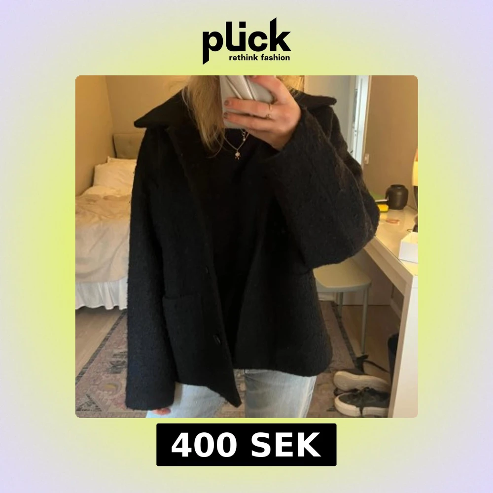 Säljer en svart jacka från Monki i ullblandning. Jackan har krage, stora framfickor och stängs med knappar framtill. Rak passform och lång ärm, perfekt för kyligare dagar.