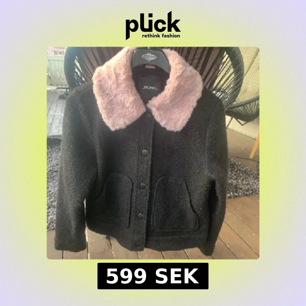 Svart jacka från Monki med stor, fluffig rosa fuskpäls-krage. Jackan har två stora fickor framtill, knäppning med svarta knappar och är i en rak, boxig modell. Perfekt för dig som vill sticka ut med en unik detalj på kragen. Kan va lite nopprig😊