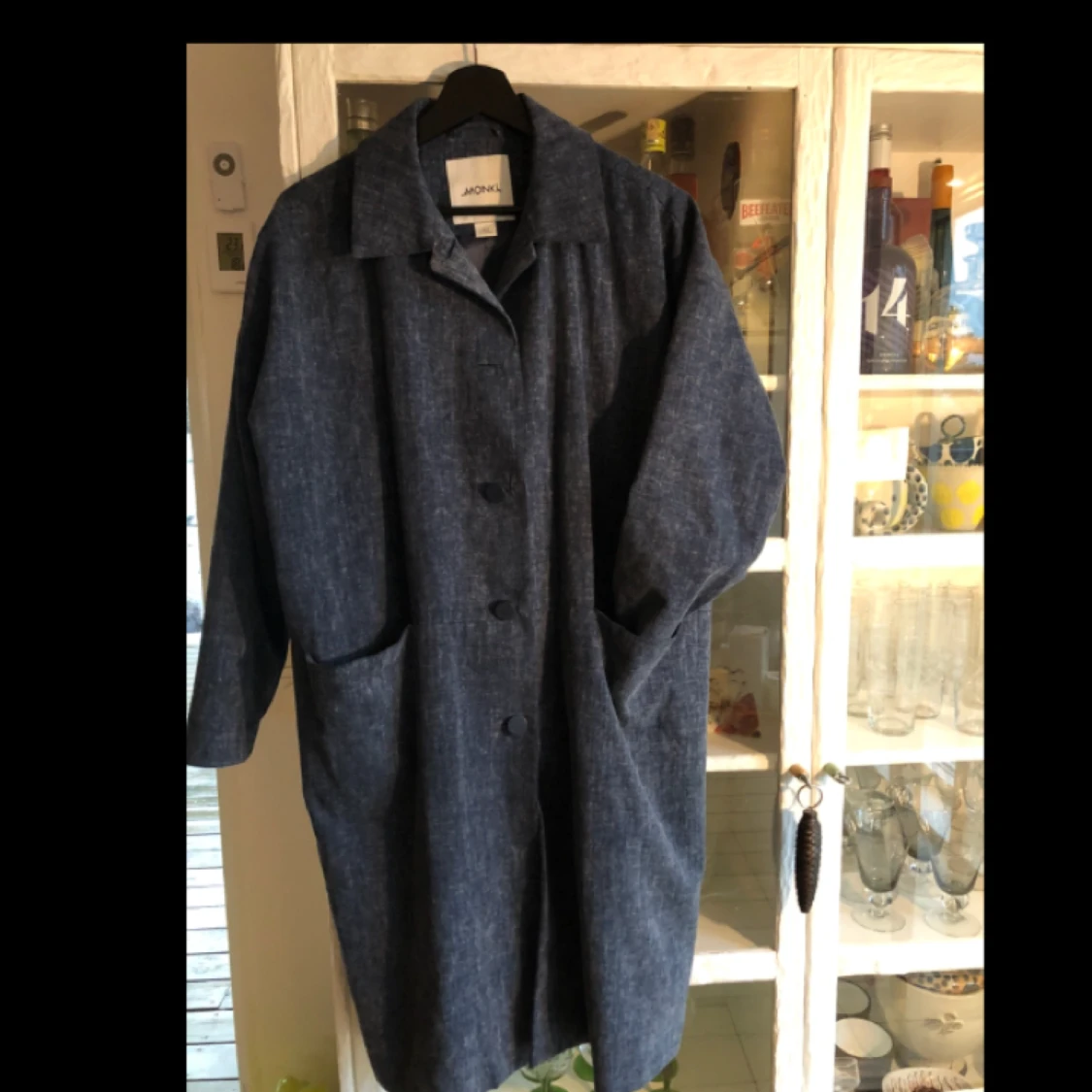 Saknar översta knappen, knälång jacka i ngt oversize känsla, passar även en medium. Har katt, fraktar mot kostnad.