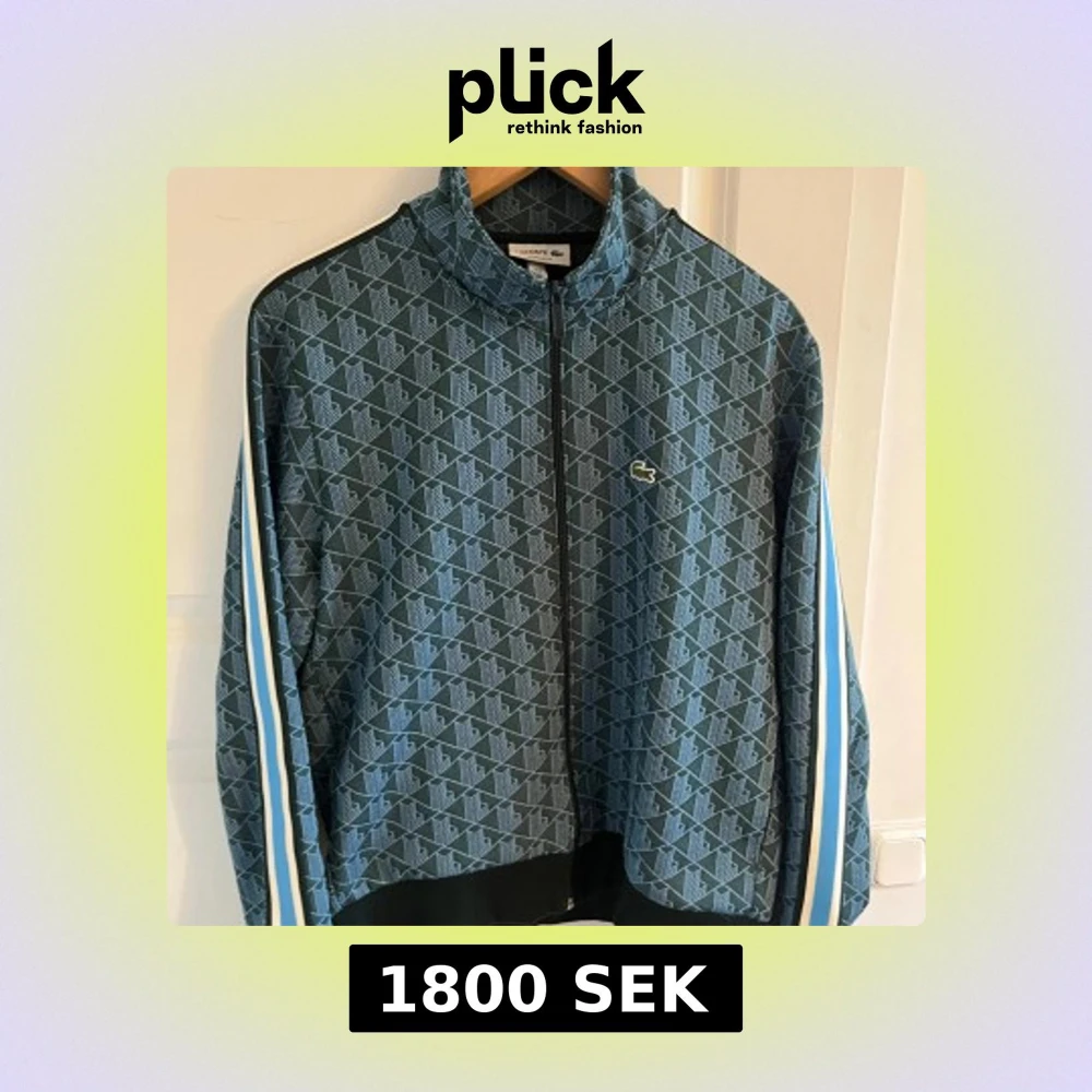 Säljer en blå track jacket från Lacoste med geometriskt mönster och dragkedja. Jackan har vita och blå ränder längs ärmarna och klassisk Lacoste-logga på bröstet. Perfekt för en sportig och avslappnad stil. Köpt i Frankrike helt ny nästan använd en gång och de var när jag väl köpte den. Har ej sätt någon ha på sig denna eller något vilket gör den unik.