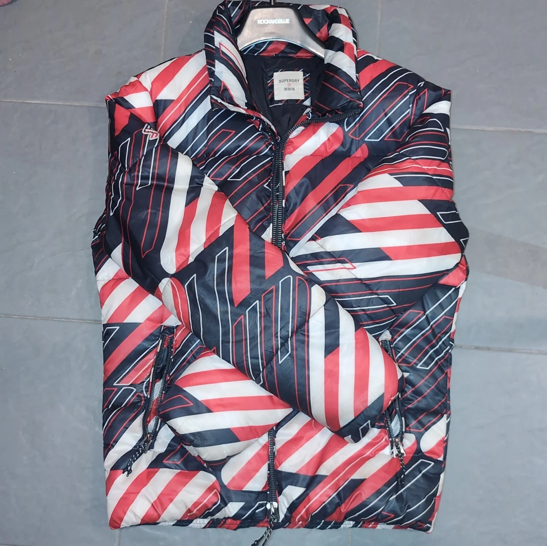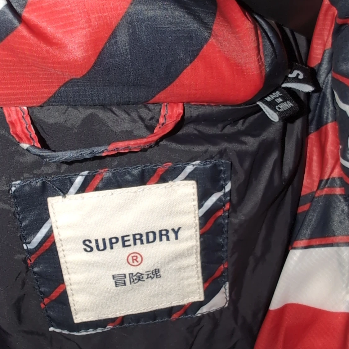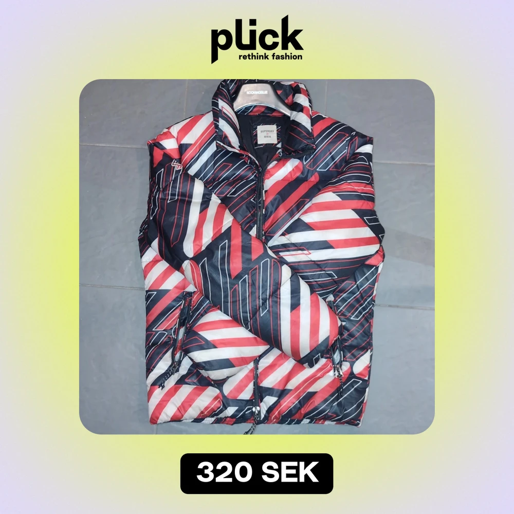 Säljer en cool jacka från Superdry i storlek S. Den har ett unikt mönster i rött, svart och vitt med dragkedja framtill. Perfekt för höst, vår och vinter och den är i mycket bra skick. Jackan har långa ärmar och är quiltad för extra värme. Passar perfekt för en casual look!
