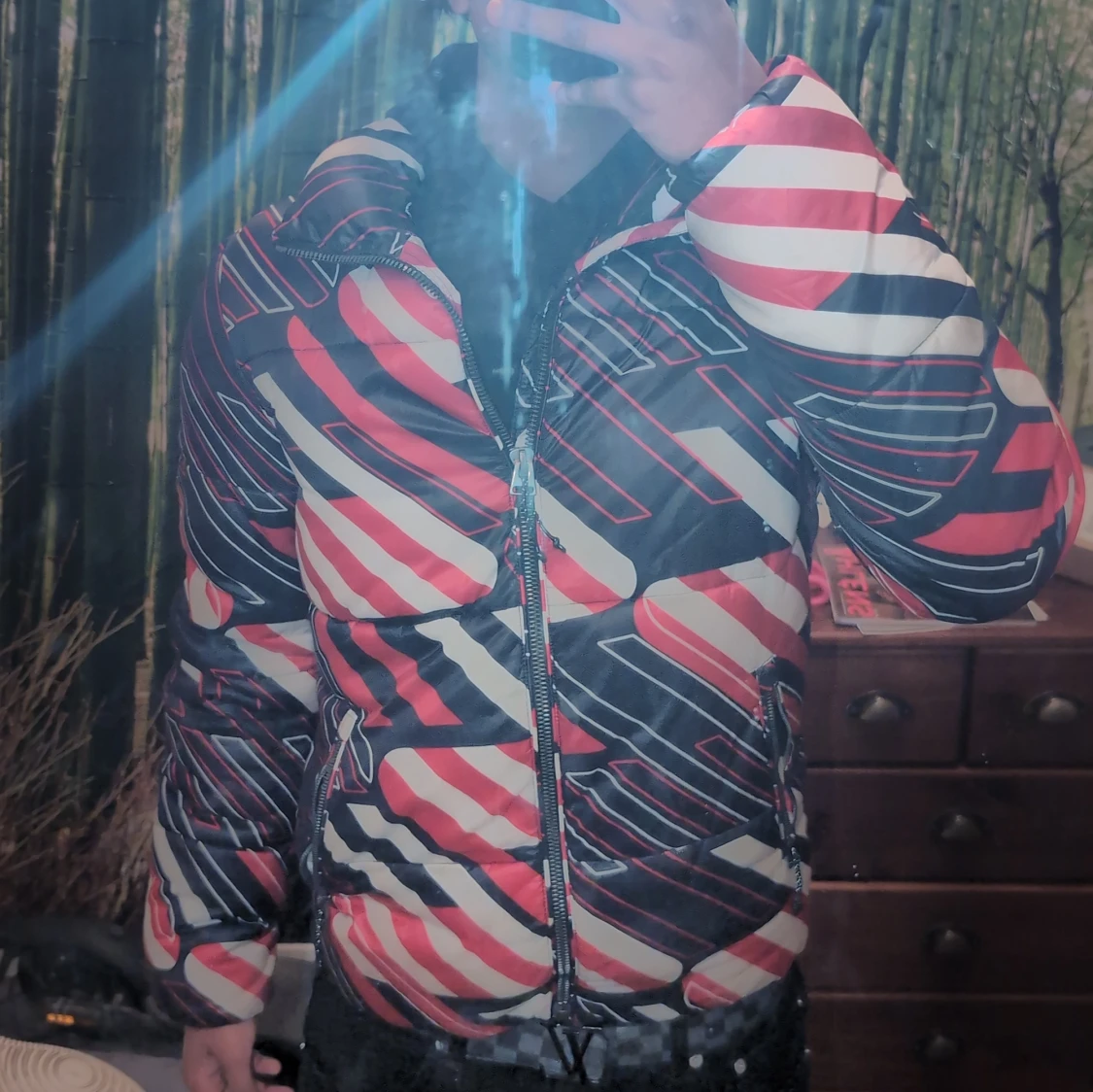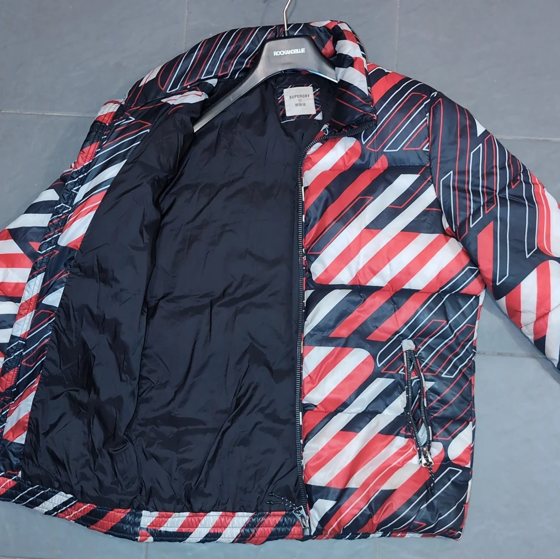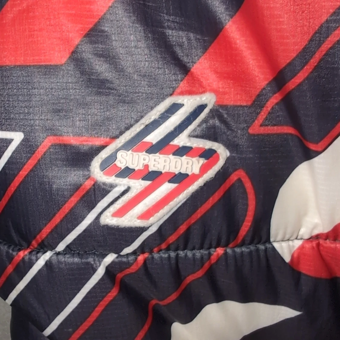 Säljer en cool jacka från Superdry i storlek S. Den har ett unikt mönster i rött, svart och vitt med dragkedja framtill. Perfekt för höst, vår och vinter och den är i mycket bra skick. Jackan har långa ärmar och är quiltad för extra värme. Passar perfekt för en casual look!