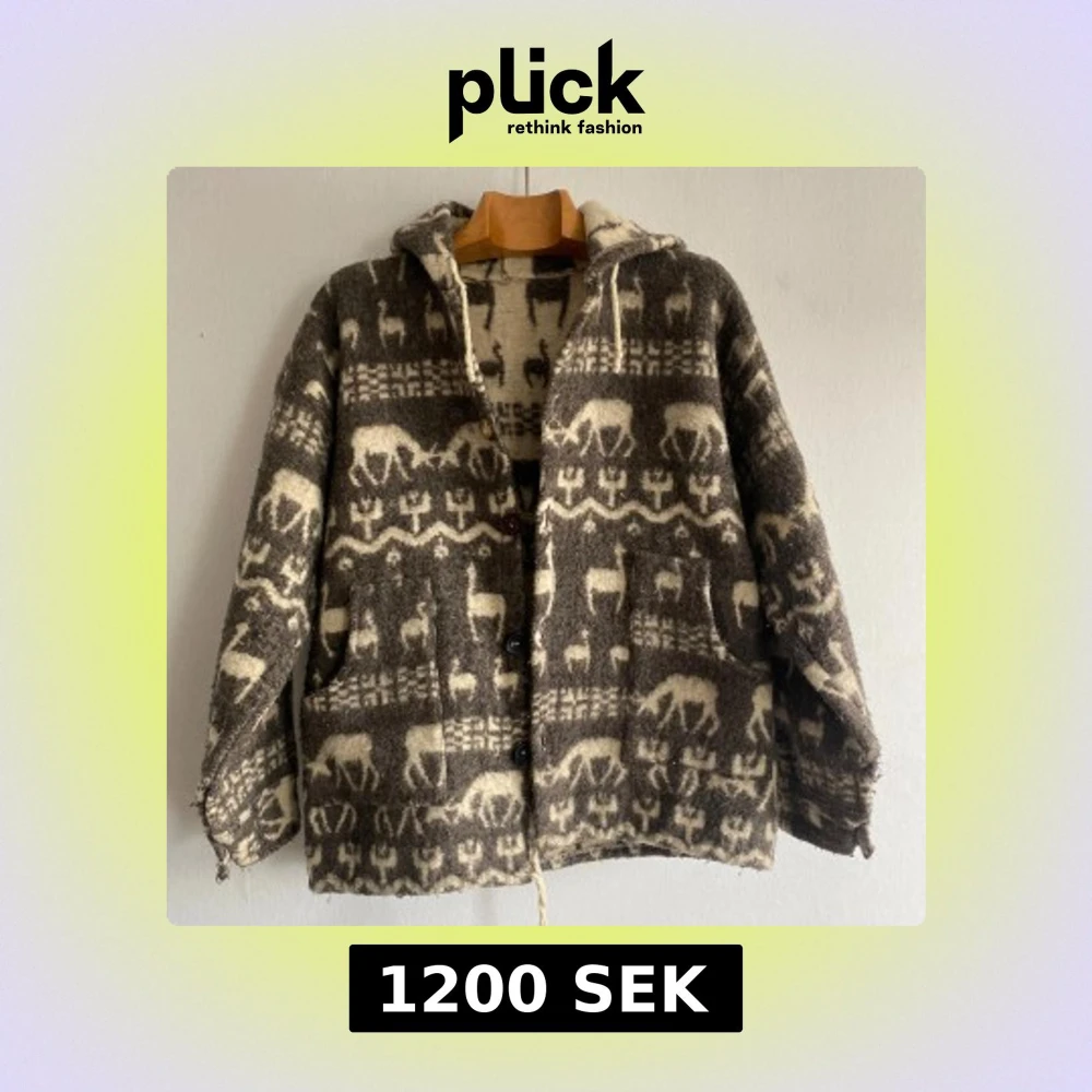 Unik jacka i tjock ull med brunt och beige mönster av renar o h lamor och geometriska former. Jackan har huva, stora fickor och knäpps med träknappar framtill, knappar finns på insidan oxå. Snöre längst ner så du kan spänna åt/justera längden. Perfekt för dig som gillar boho-vibe och vill sticka ut med ett cozy plagg. Sista bilden visar en liten mini missfärgning. Jackan uppskattas till en Large.