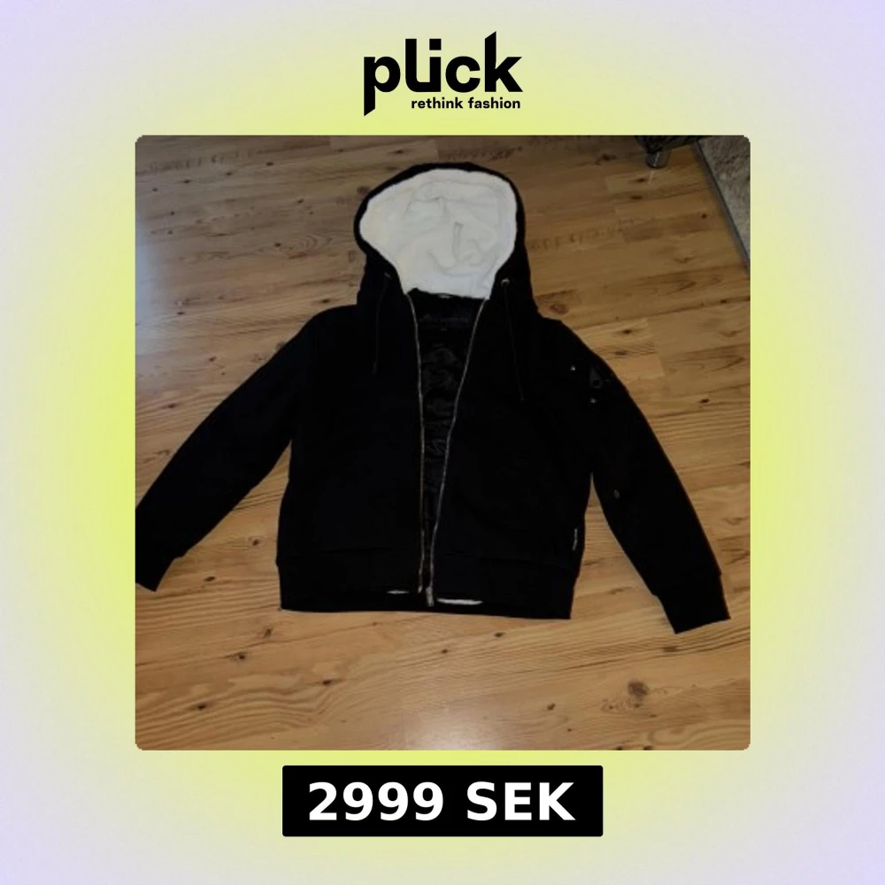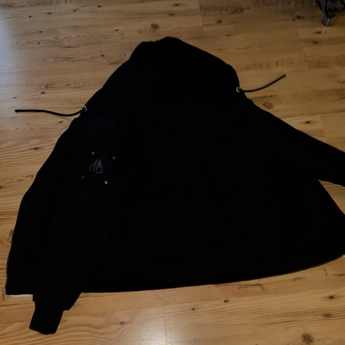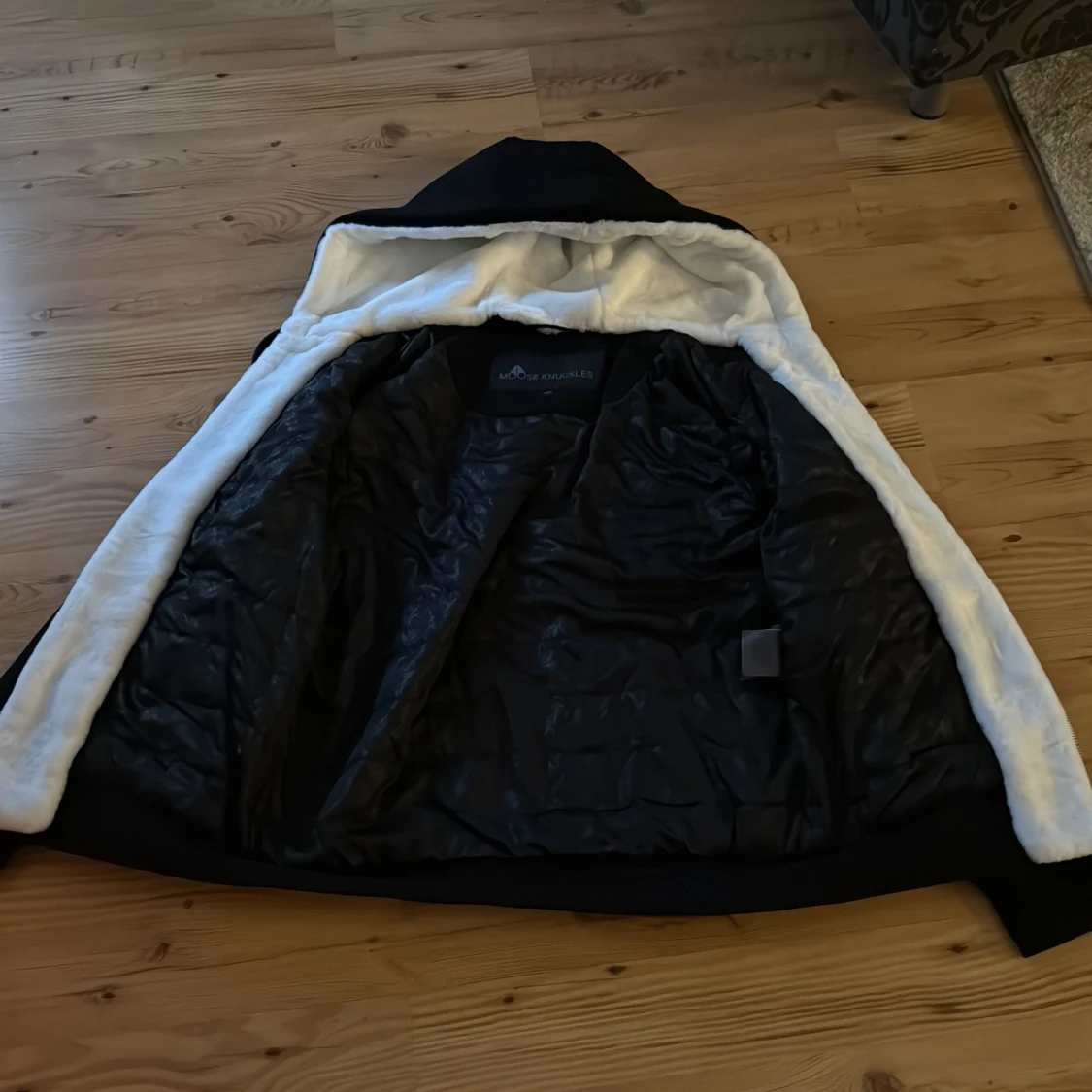 Svart hoodiejacka från Moose Knuckles med vit fluffig fuskpäls i huvan och quiltat svart innerfoder. Jackan har dragkedja framtill, snörning i huvan och en ikonisk logga på ärmen. Perfekt för kalla dagar och har en riktigt chill vibe.